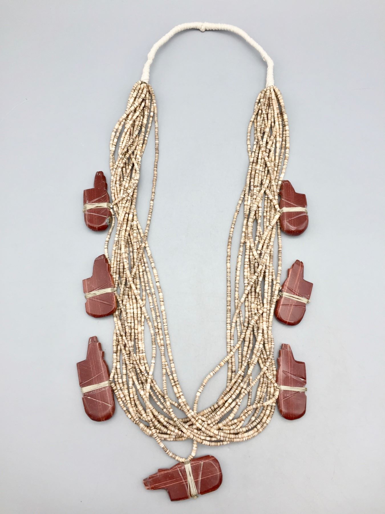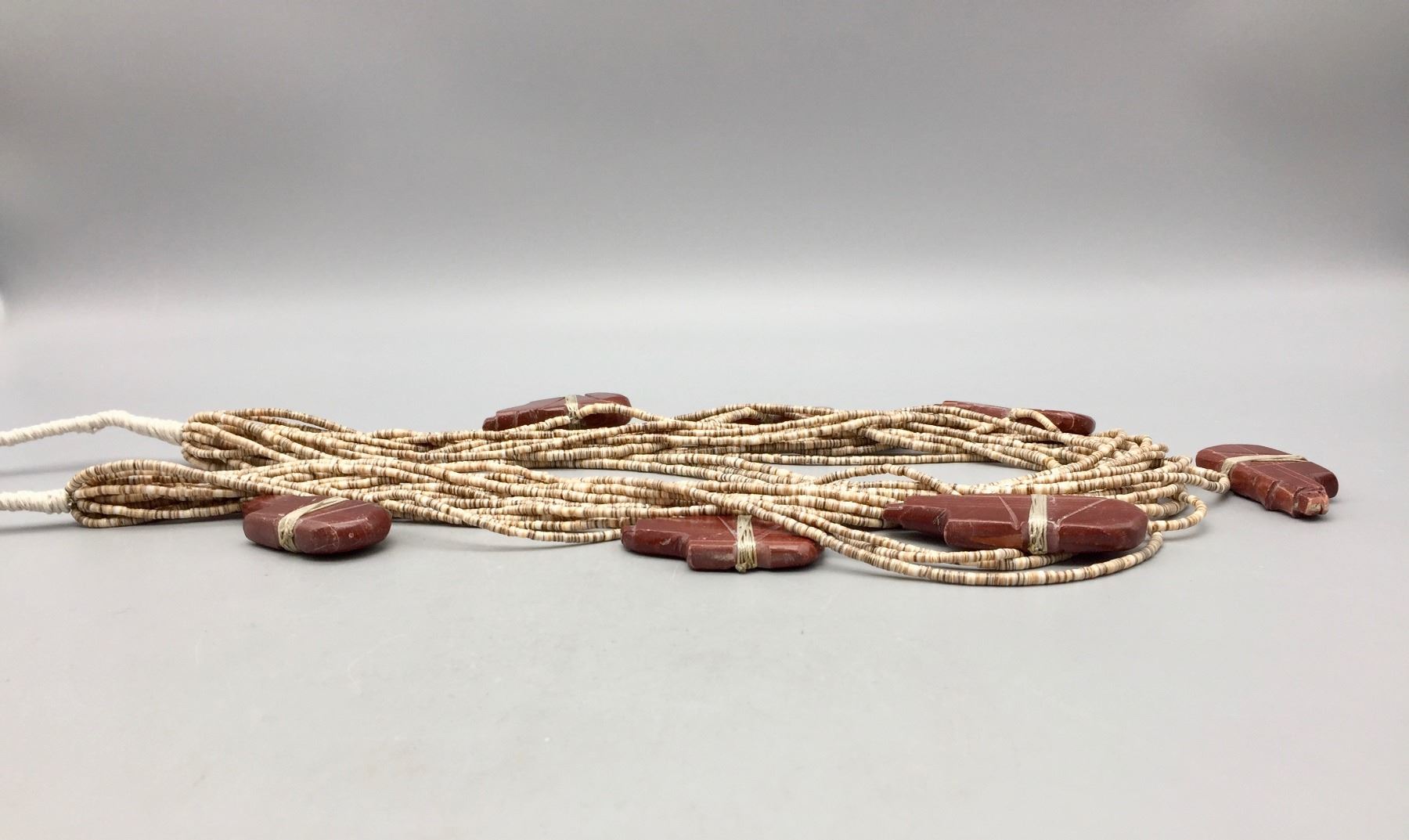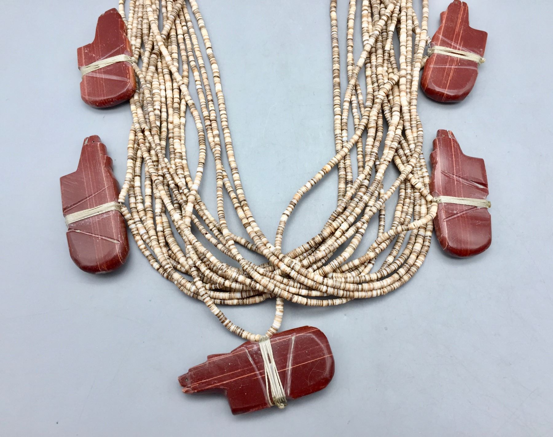 Description: For sale in this lot is a 17 strand necklace! It features fine heishi beads and 7, bear shaped pipestone fetishes. It is finished off with a traditional “Native” wrap. Maker: Unknown. Approx. Age: Vintage. Size: Fits a 33” neck. Weighs approximately 438 grams. Condition: Good for its age, normal wear expected. Please look closely at the pictures - they are an important part of our description. Shipping: There will be a $5 handling / packaging fee for shipping this lot. The actual cost of postage will be added on top of that.