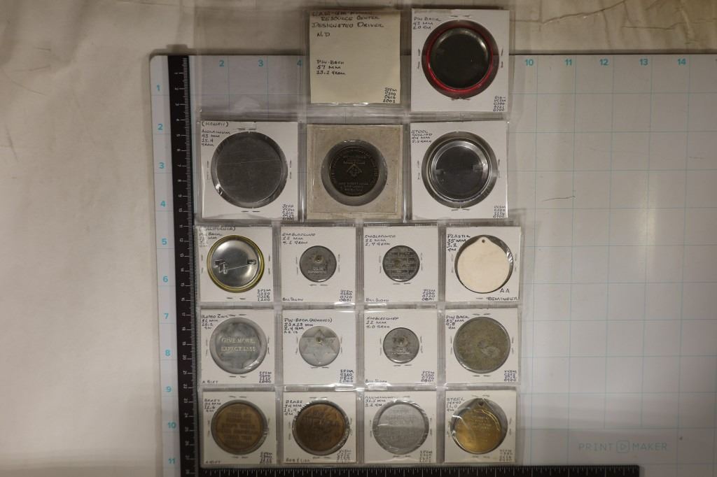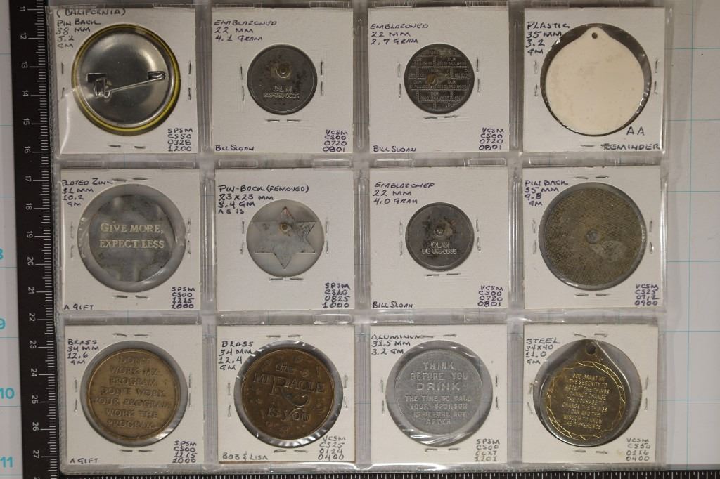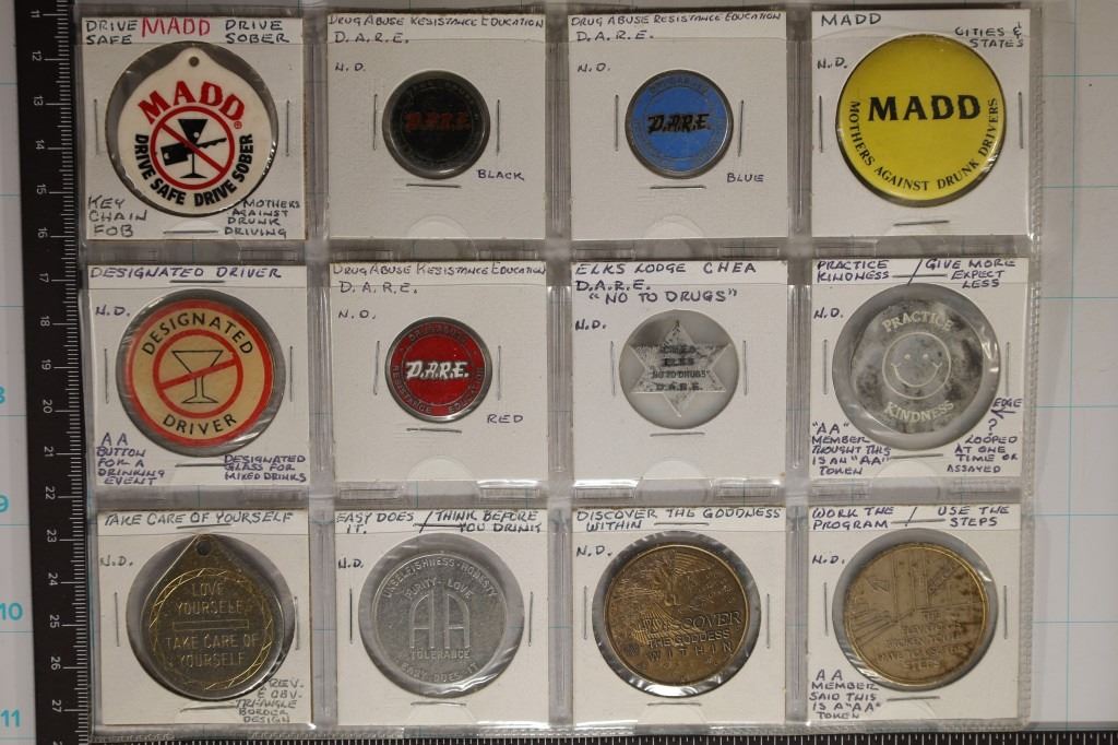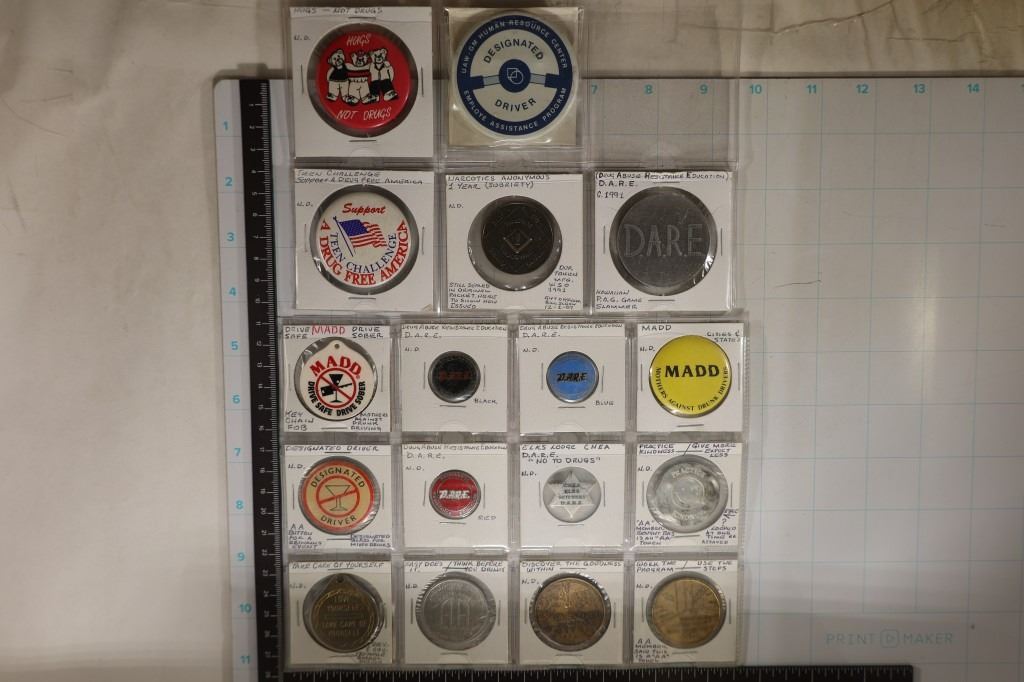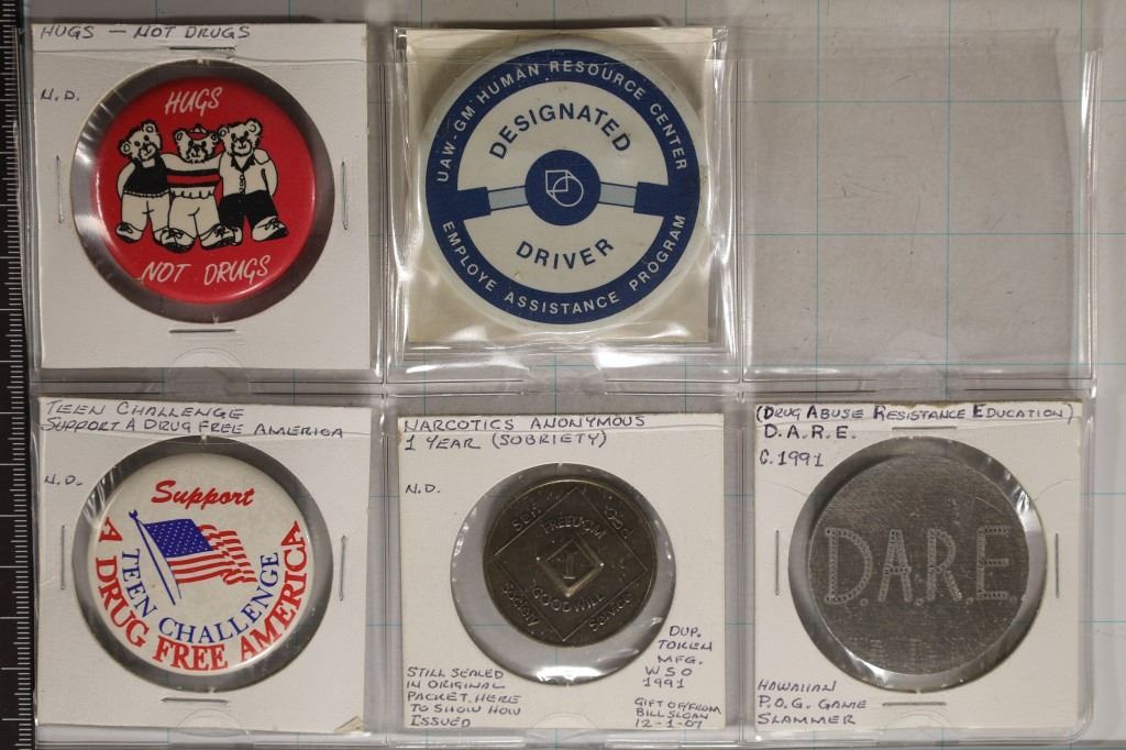 17-TOKENS, PINBACKS, BUTTONS ABOUT DRUG ABUSE,