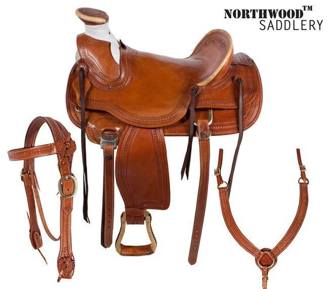 Brand: NorthWood Saddlery Brass hardware and conchos Premium medium oil leather Designed for work Leather rapped horn Multiple ties on saddle contoured breast collar Saddle Measurements: Gullet 7" FQHB Cantle 5" Skirt 30" Horn 3", 4.5" across the top of the horn Stirrups 34" - 40" Weight 30