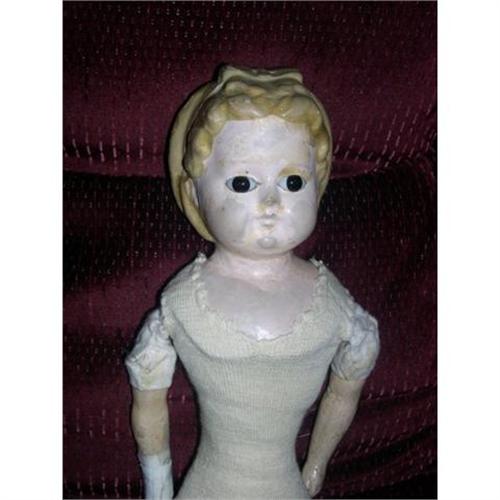 17" Wax Over Glass Eye Girl Doll sold As Is. Doll has repaired foot and missing right hand. The orange painted boots are original and three is a blue painted band at the top to indicate the top of the socks. It's the doll's right leg/boot that has been damaged and reglued. She has the sold black pupil glass eyes. I don't believe three has been any repaint to the head. You can see in the picture there are rub spots but she still has a cute face. There is a molded bow on the top of her hair and vertical curls in the back. The stockinette piece is covering the body so don't know if it is the original or what so this item is sold as is. She is an early piece. Doll comes from a smoke free environment. Buyer to pay 12.00 shipping, handling, and insurance. Thanks for viewing.