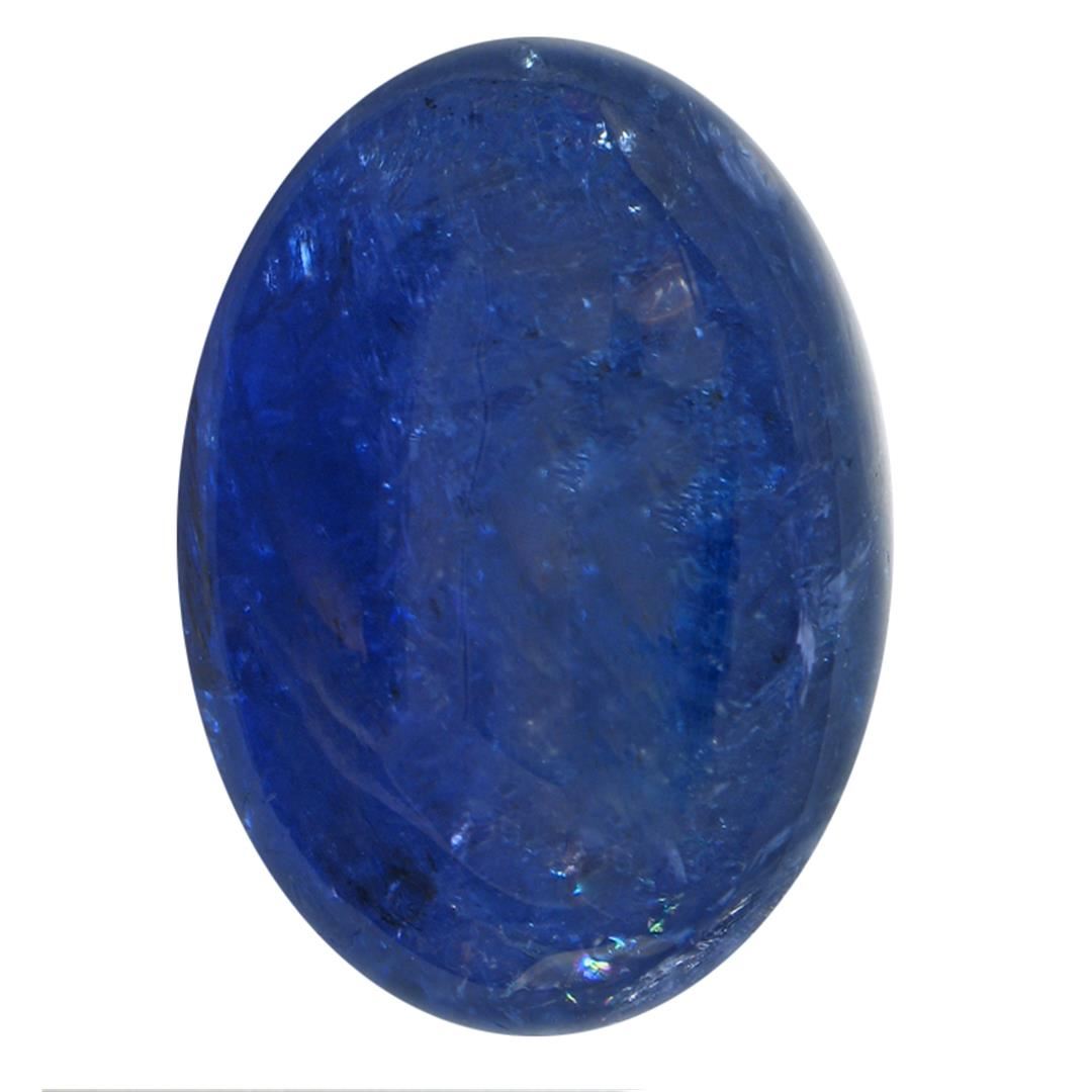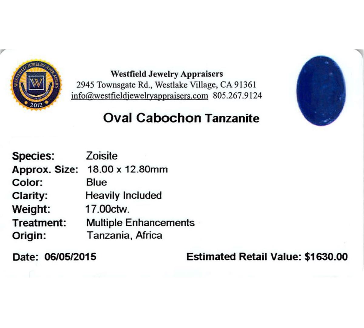 One oval cabochon cut natural tanzanite, measuring 18.00 x 12.80 x 8.00mm, exact weight 17.00ct., clarity is heavily included, type I, dark, very slightly grayish, blue color, (GIA B 7/3), cut is good. Transmitting light somewhat diffusely, transparent to translucent. Naturally occurring internal & external characteristics are present. Indications of heat treatment. Westfield Appraised at $1,630.00.
