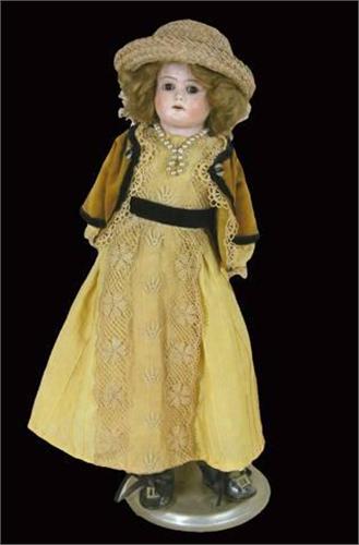 17 inch bisque doll marked W&C 7/0, yellow dress, face has been broken and repaired.
