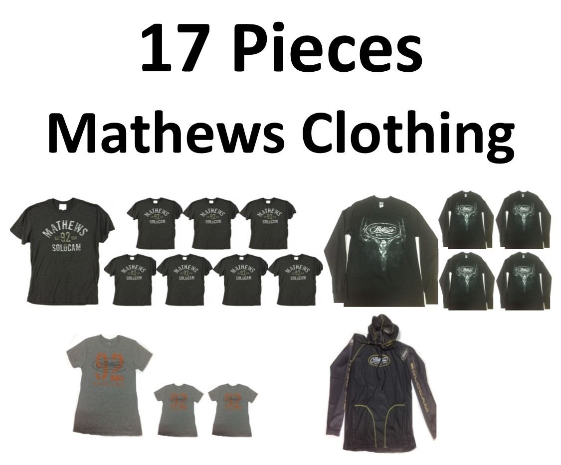 17 x Mathews Clothing, 11 x Scout T-Shirts, 2-M, 3-L, 2-XL, 1-2XL, 3 x Grey w/Orange 92, 1-M, 1- L, 1-XL, 5 x Long Sleeve Black/White Skull, 1- M, 4-L, 1 x Performance Hoodie XL