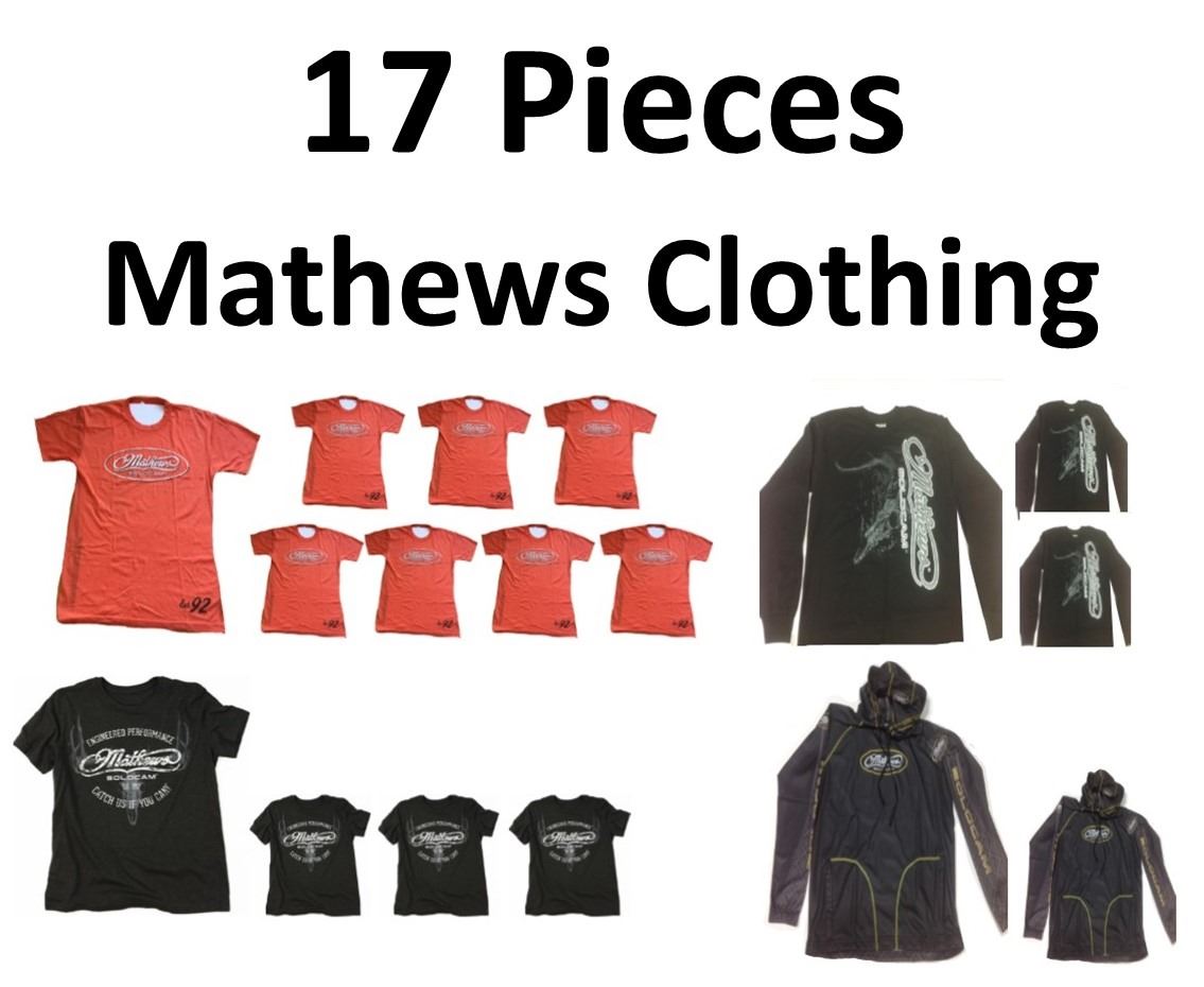 17 x Mathews Clothing, 8 x Blaze Orange, 1-2XL, 4-XL, 2-L, 1-M, 3 x LS Black/Grey, 2-L, 1-XL, 1 x Black w/White Logo Skull XL, 3 x Outfitter Shirts, 1-M, 1-L, 1-2XL, 2 x Performance Hoodie, 1-L, 1-XL
