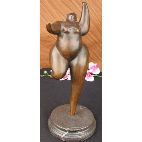 11XNFT01780 The Curvy Nude Woman Bends Her Knee To Make Her Next Move In Her Complex Dance. The Composition Recalls The Classical Sense Yet Adopts A Modern Abstract Flair That Gives Her Body An Added Emphasis On Her Curvaceousness. She Seems To Coyly Look Up As If Blushing Due To The Gushing Admiration She Gets From The Beholder Witnessing Her Body. The Bronze Sculpture Was Captured Using The Ancient Method Of Lost-Wax Casting And Finished With A Brown Patina Stain For Preservation. She Is Mounted Upon A Black Marble Base With The Artist Milo'S Signature. The Artist Milo Lived Most Of His Childhood In Andalusia, Spain. Influenced By An Artistic Family Background, He Began Sculpting At The Age Of Seventeen. After Apprenticing With Several Accomplished Sculptors Both In America And Spain, He Began His Own Work Focusing Equally On Steel And Bronze...................SHIPPING USA: $20....HI, ALASKA, CANADA: $49...ALL OTHER COUNTRIES: $89