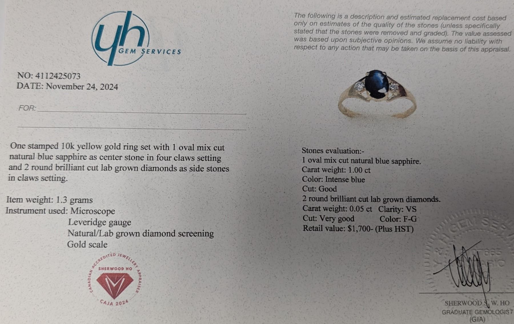 $1700, 10K(1.3g), SAPPHIRE (1ct), DIA (0.05ct)RING, size 6.5, appraised value $1700, ring resizeable for $50