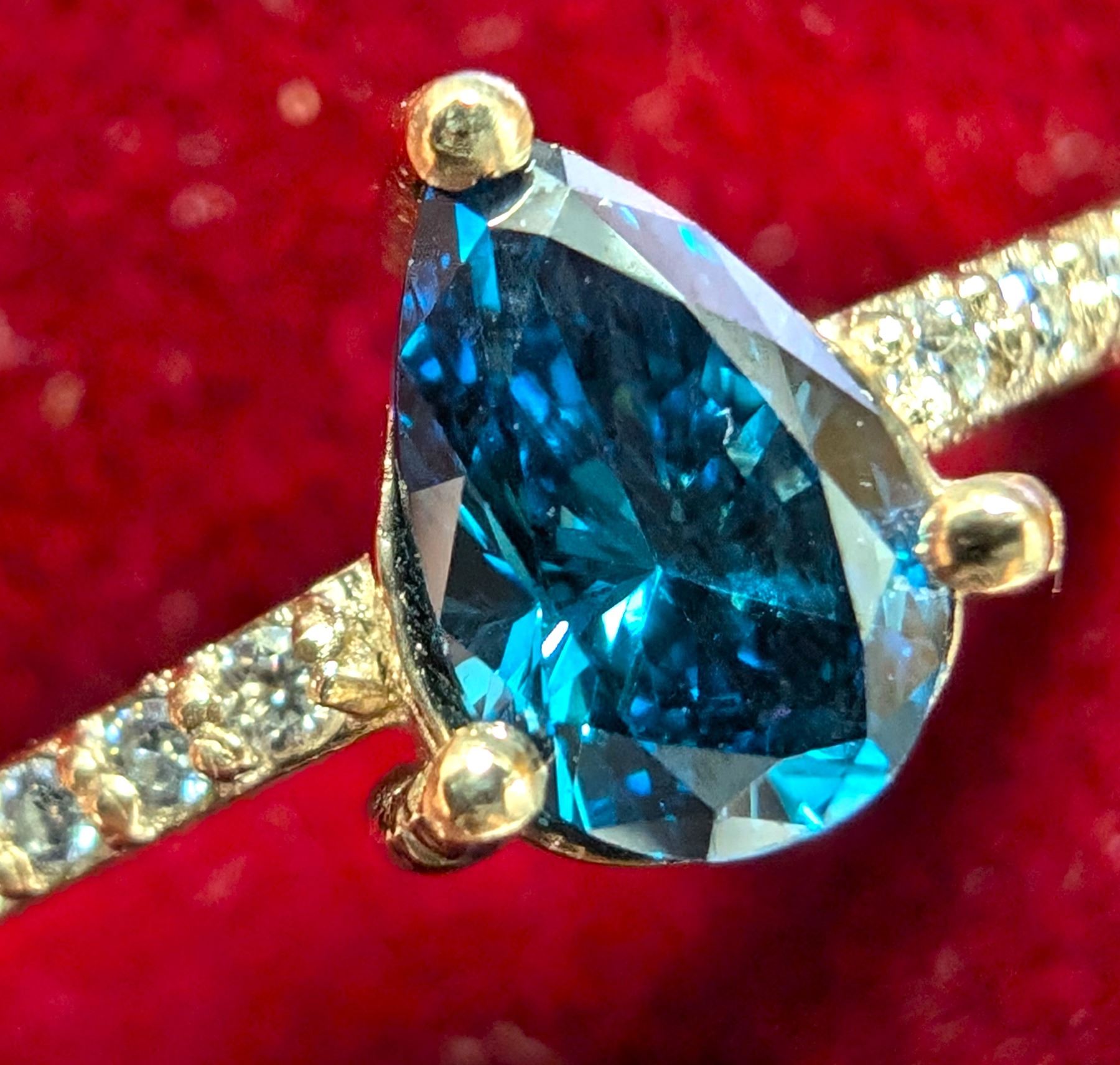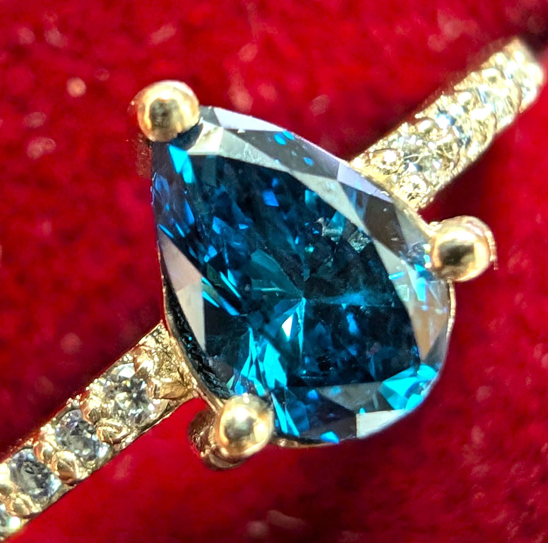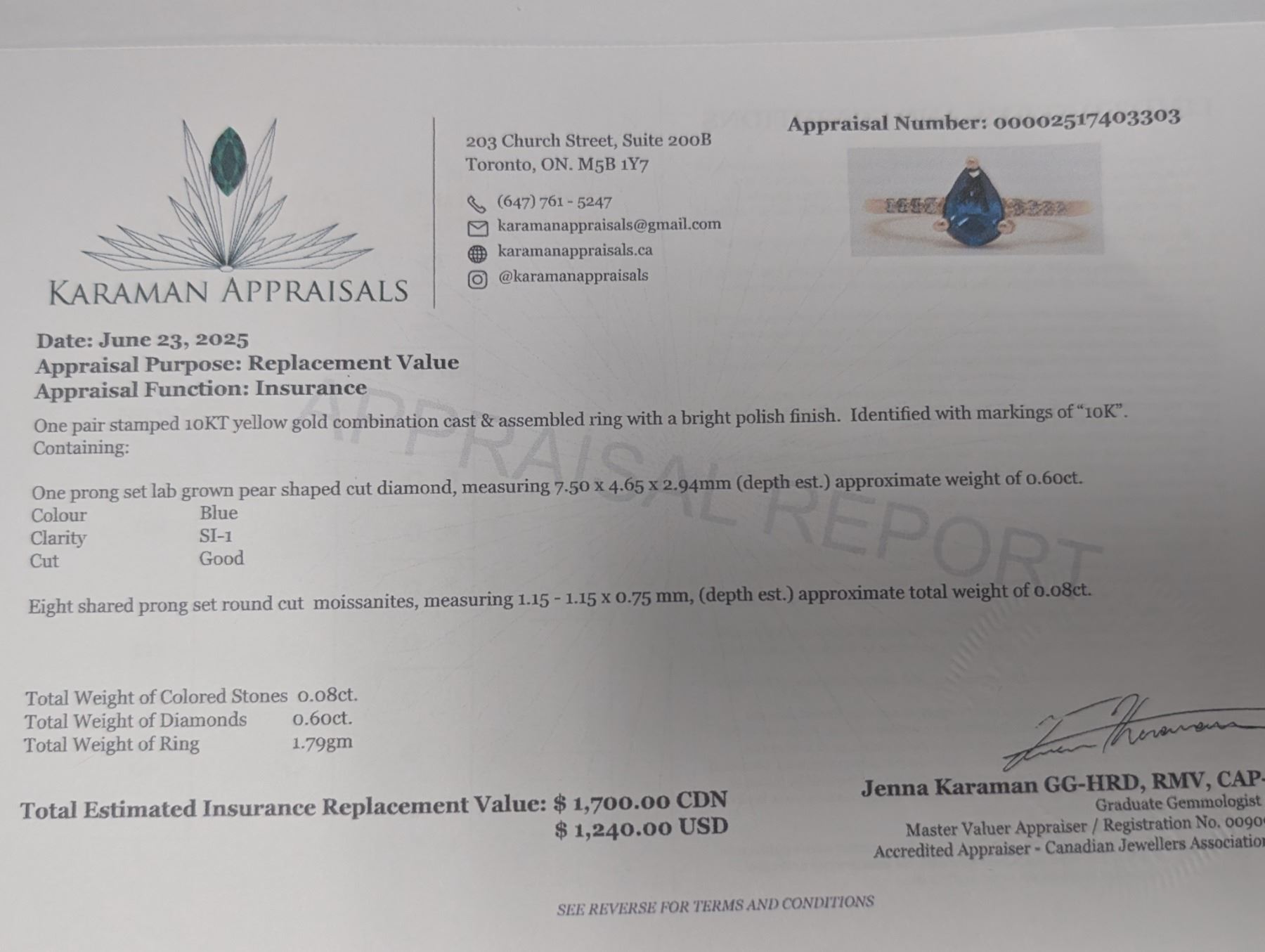 $1700, 10K(1.79g), LAB BLUE DIAMOND (0.6ct), MOISSANITE (0.08ct)RING, size 6.5, appraised value $1700, ring resizeable for $50