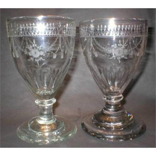 This is an amazing pair of free hand blown engraved Georgian Rummers in excellent condition with no chips or cracks. This pair has been looked at by a few different appraisers and also viewed by Tom Bredehoft and no one knows exactly who made these beauties but all agree they are Georgian Period Free Hand Blown Rummers from the late 1700's thru early 1800's, no later than 1820. There are typical imperfections in each of these due to the fact that they are completely hand made and design is dependenton the expertise of the glass blower. They have bubbles here and there, especially in the footing and some small pieces of carbon inside the glass on the footing of one of them. There is of course wear to the bottom of each of them around the edges of the base which should be expected as they are over 200+ years old! The engravings on these are a beautiful swag and flower with tassle design and an egg and tulip design around the top rim. The bowls are an ovid shape and have a petal design along the bottom sides. This pair is completely hand blown, no molds, and are of two different sizes and thickness due to the fact that they are hand made. One has a slightly lavender tone to it due to the maganese in the glass and sun exposure and the other one has had less exposure to the sun. This pair would make a perfect wedding set as a his and hers as if you notice the stems and footing on them, one is thicker and more masculine than the other and the one that is less thick is slightly taller ...