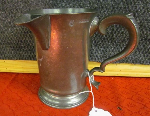 Marked 1700's Quart Pewter Tankard with spout and handle inscribed horseshoe and Wheat sheaf 6.5" tall