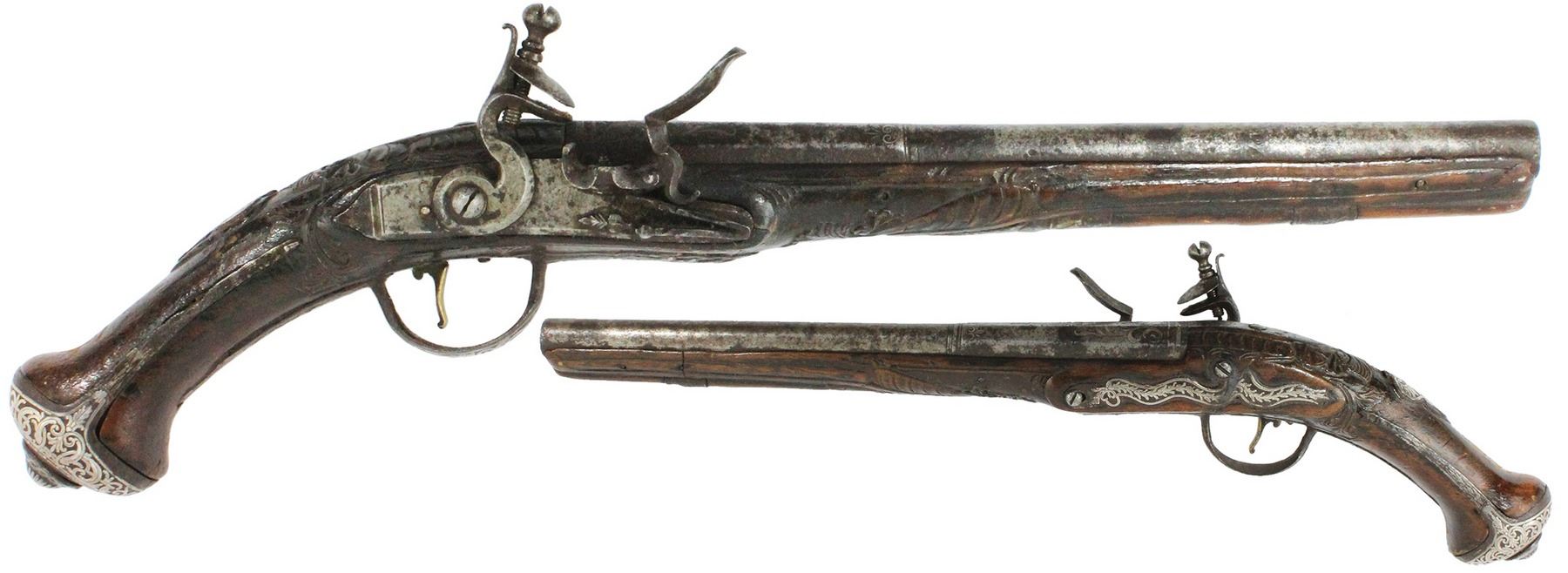 1700s European flintlock pistol stamped with "London." , 903 grams, 18-1/2" long, 11-1/2" barrel. Sturdy gun with deep touch mark, lacquered walnut stock with carved decorations, ornate iron mounts and decorative silver inlay, carved faux ramrod, original "S" form hammer, decorated spring and pan, all in original condition with a few divots in wood. With photo-certificate.