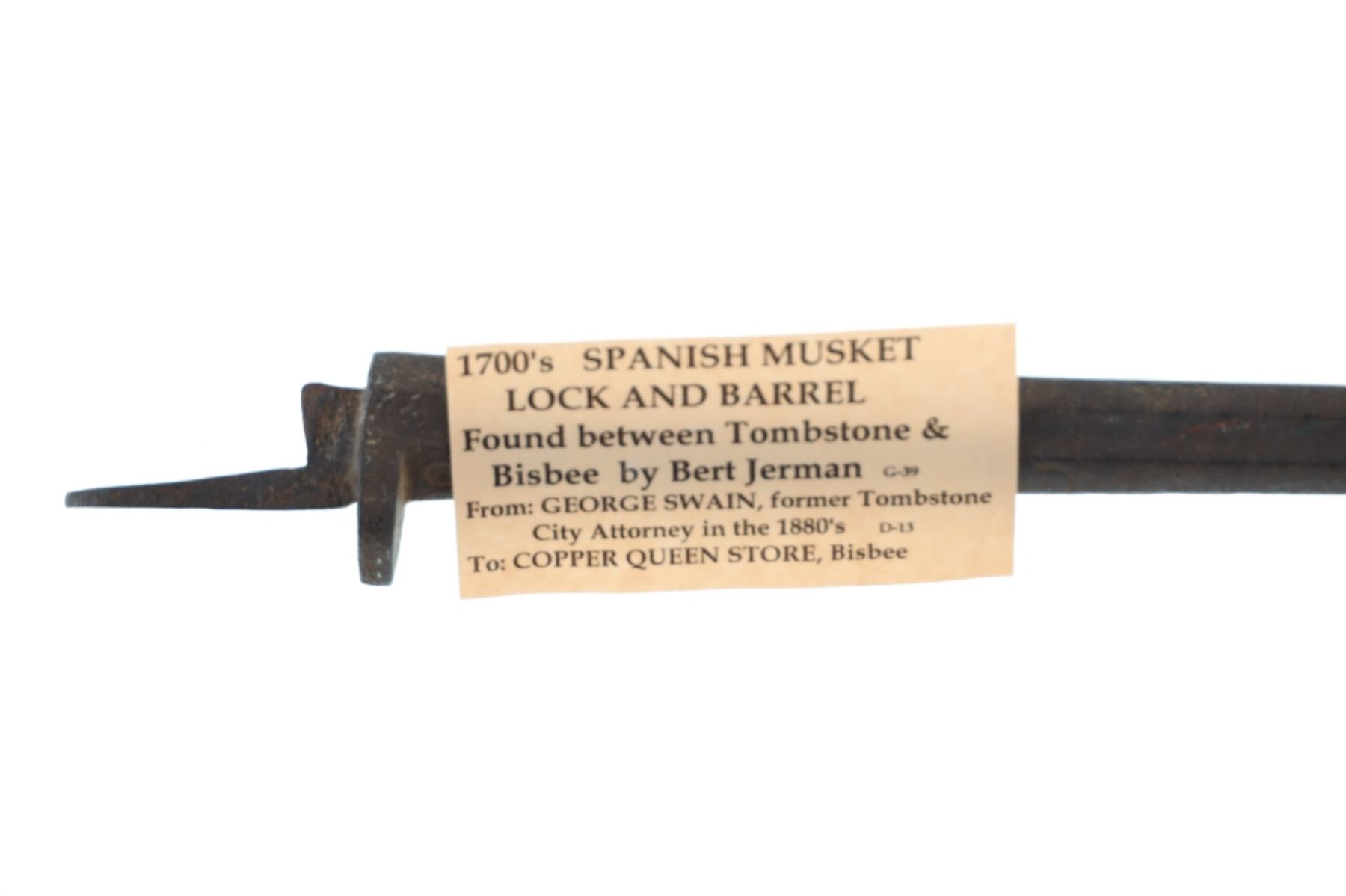 Featured in this lot is this Ex George Swain Collection Spanish Musket Lock and Barrel circa 1752 to 1757 and was displayed in the Tombstone Western Heritage Museum; Provenance: From the Tombstone Western Heritage Museum in Tombstone, Arizona. The musket barrel features a wonderfully and professionally crafted construction that shows a slight flair to the barrel and shows the proof mark towards the genesis of the barrel. The musket barrel comes complete with an original museum tag that reads as follows: 1700's Spanish Musket Lock and Barrel found between Tombstone & Bisbee by Bert Jerman - From: George Swain, former Tombstone city attorney in the 1800's - To: Copper Queen Store, Bisbee. 1752 Spanish musket barrel and lock represent the typical military firearm technology of mid-18th century colonial Spain. These muskets were flintlock in design, featuring long, smoothbore barrels designed for use by infantry. The lock mechanism was robust and reliable for the time, with a steel frizzen and flint striking system that ignited the powder charge. Commonly referred to as “Modelo 1752,” these muskets were used throughout Spain’s colonies, including in the Americas, and played a role in both military campaigns and frontier defense. Surviving examples are valuable artifacts, often marked with Spanish proofs and armory stamps. The condition of this lock and barrel musket is well preserved with some oxidation consistent with age but otherwise shows a well preserved condition. The measurements of this lock and barrel musket is 35" x 2 1/4" x 1 1/8". The collective weight of this Lock and barrel musket is