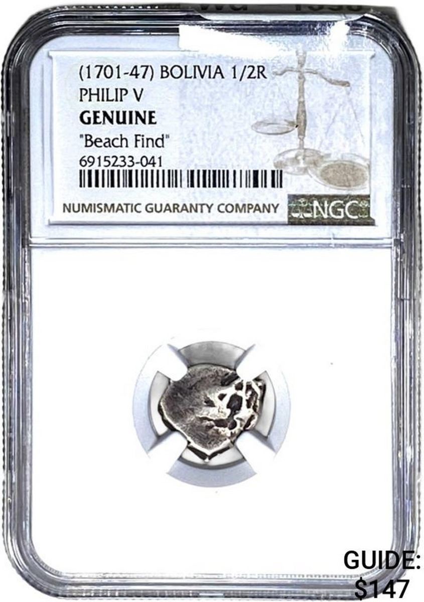 [1701-47] Peru 1/2 Real-Philip V "Beach Find" NGC GENUINE