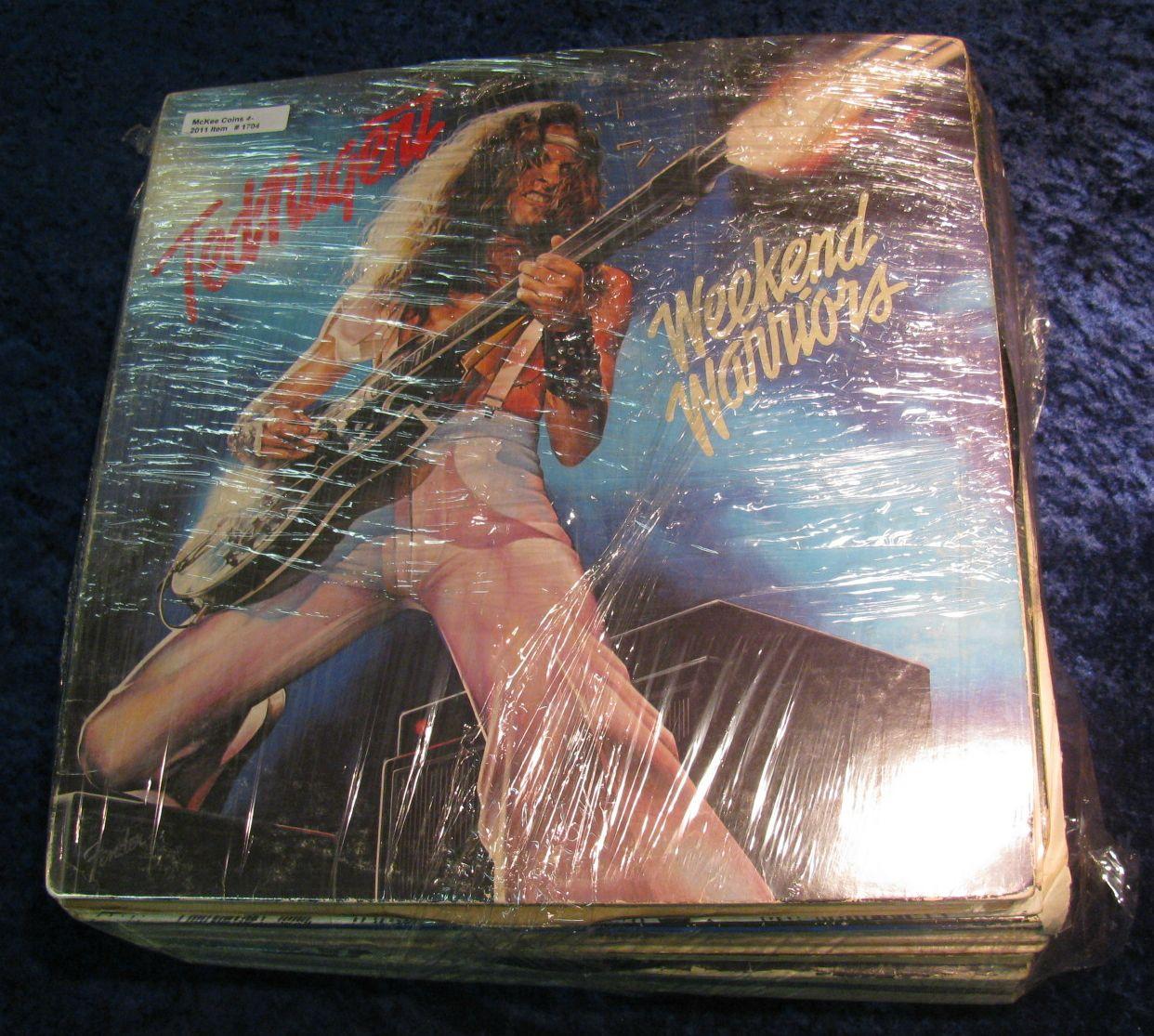 1704. Large group of 33 1/3 RPM Records. Includes "AC/DC Highway to Hell"; "The J.Geils Band Showtime"; "Sammy Hagar Standing Hampton"; "Queen Jazz"; "Cheap Trick/Heaven Tonight" Autographed; "Aquarius April Wine" Autographed; "Tom Petty and the Heartbreakers Dam the Torpedoes"; "Ted Nugent Weekend Warrior"; "Aerosmith Rocks"; "Billion Dollar Babies Alice Cooper"; "Rush"; "Styx The Grand Illusion"; "Denny's Restaurants Laker's Magic"; several Elvis Albums and much more. This group probably weighs 10-15 Pounds.