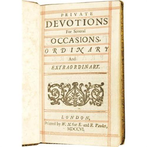 <B>1706 </B></I><B><I>Private Devotions For Several Occasions Ordinary and Extraordinary</B></I></B></I>. (London: Printed for W. N. for E. and R. Pawlet, 1706), 98 pages, full leather binding with gilt decoration to front and rear boards, gilt dentelle, gilt floral decoration in six compartments between five raised spine bands, marble endpapers, all edges gilt, 16mo (3.75” x 6.25”), former owner’s bookplate on the front pastedown, light rubbing to boards and corners, slight foxing to prelims, else contents sound, bright and in near fine condition.<BR><BR><BR><b>Shipping:</b> Books & Catalogs (<a target="_blank" href="http://www.heritageauctions.com/common/shipping.php">view shipping information</a>)