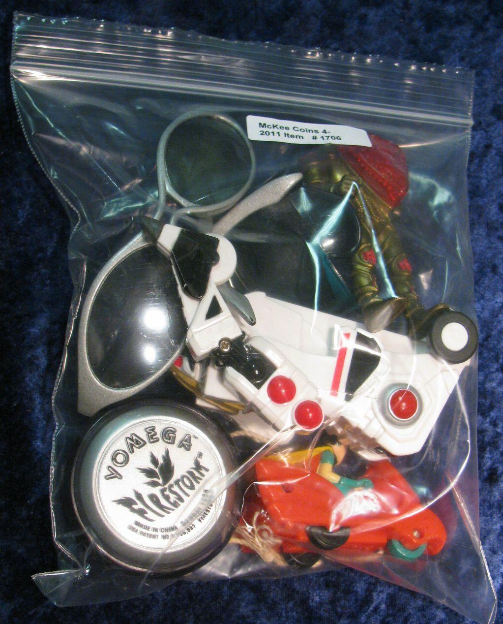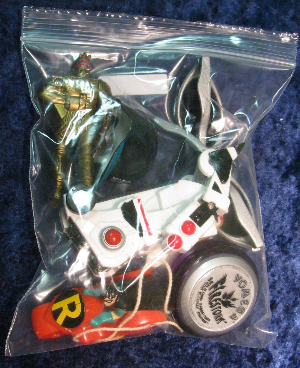 1706. Yomega Firestorm Yo Yo; 1993 DC "Robin" on scooter; 1994 Empire of Carolina Robot; Sunglasses; Baseball Helmet; Super Vilain which lights up.