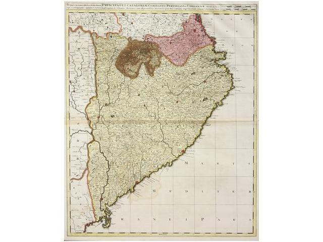 1709 CA., MAPA: VALK, LEONARD:, PRINCIPATUS CATALONIAE COMITATUS PERPINIANI ET CEDANNAE divisi in suos episcopatus et urbanos ditiones., Mapa grabado al cobre, coloreado de época. 60 x 49 cm.