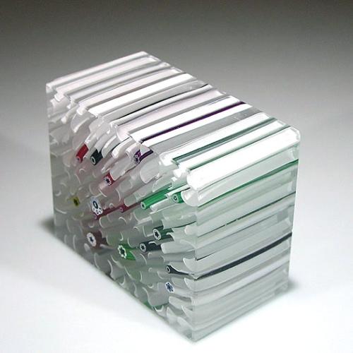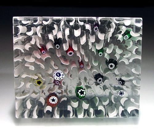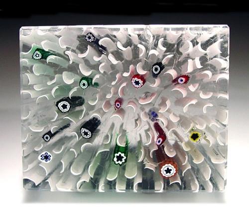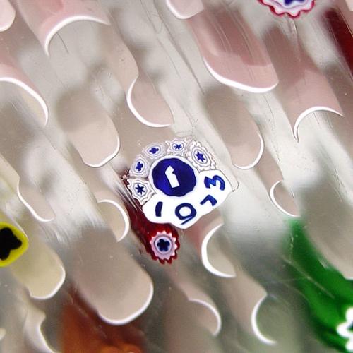 Whitefriars 1973 millefiori block paperweight, composed several, scattered, long pieces of complex millefiori, in assorted colors, surrounded by spaced sections of long white rods, on clear ground. Signature/date cane. Length 2 3/4", width 2 1/8", depth 1 1/2". Minor wear on edges. NO RESERVE