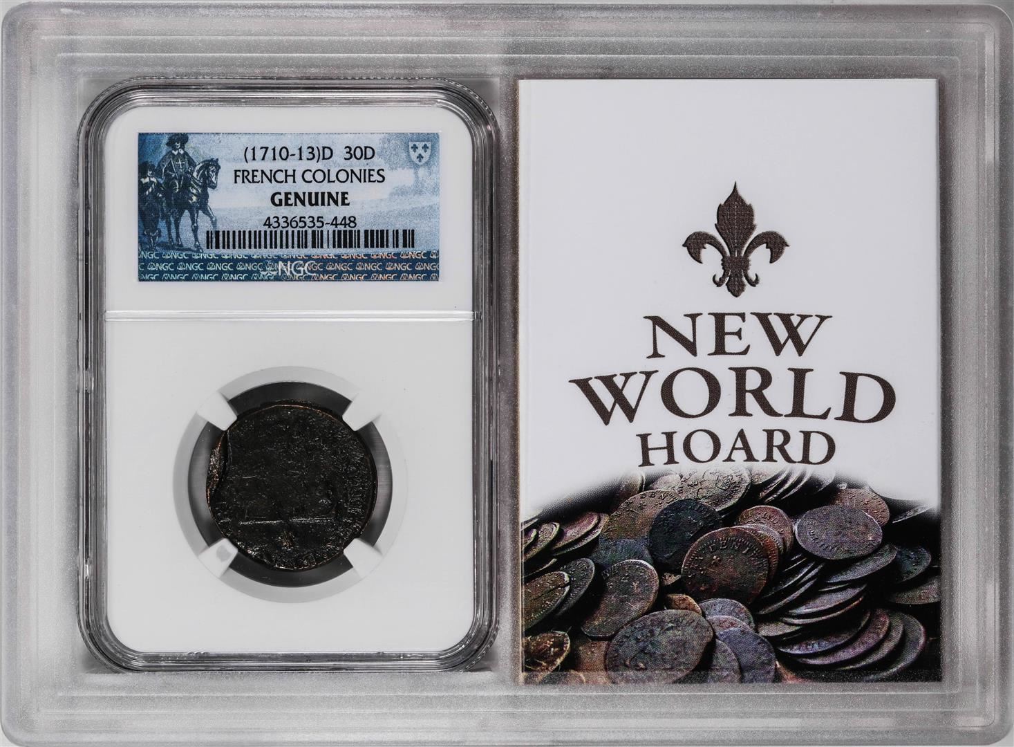 One 1710-13-D French Colonies 30 Denar New World Hoard NGC Genuine with Story Box. NGC Certified.