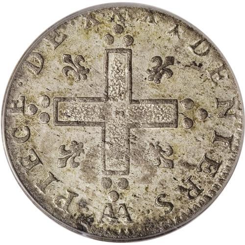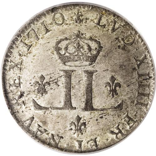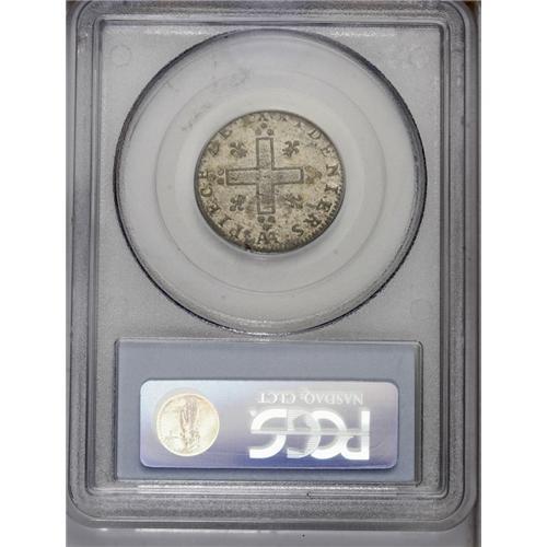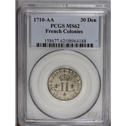 <B>1710-AA<30DEN> French Colonies 30 Deniers MS62 PCGS.</B></I> Breen-282, Vlack-8. Metz Mint. Hints of tan toning overlie unmarked cream-gray fields. A good strike, although minor striations from the planchet are found here and there. A small edge flaw noted at 11:30, and the strike is off a few degrees toward 7:30. Listed on page 51 of the 2007 <I>Guide Book.</B></I> Population: 3 in 62, 1 finer (7/06).