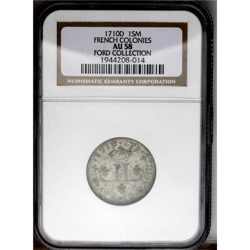 <B>1710-D<30DEN> French Colonies 30 Deniers AU58 NGC.</B></I> Ex: John J. Ford, Jr. Collection. Vlack-2, R.2. Breen-280. Gently toned dove-gray with olive tinges, but the silvering is mostly complete. The top of the date shows slight striking weakness. Listed on page 51 of the 2007 <I>Guide Book.</B></I>