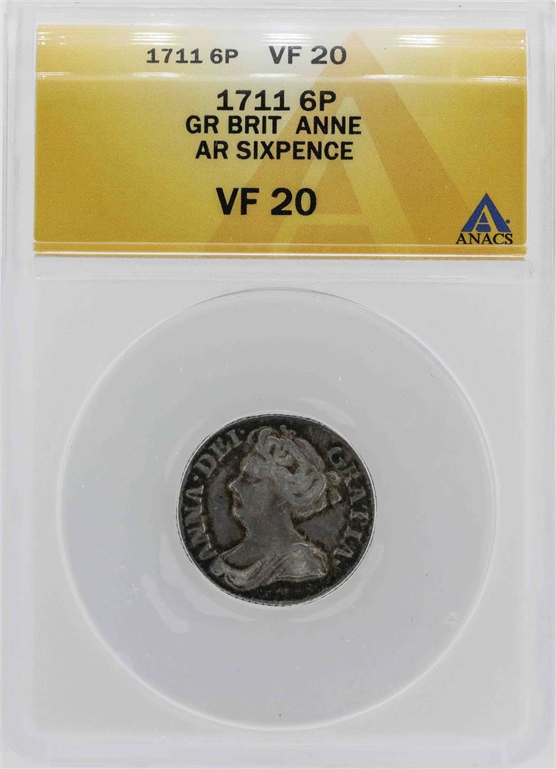 One 1711 Great Britain Queen Anne Six Pence Coin ANACS VF20. ANACS Appraised.