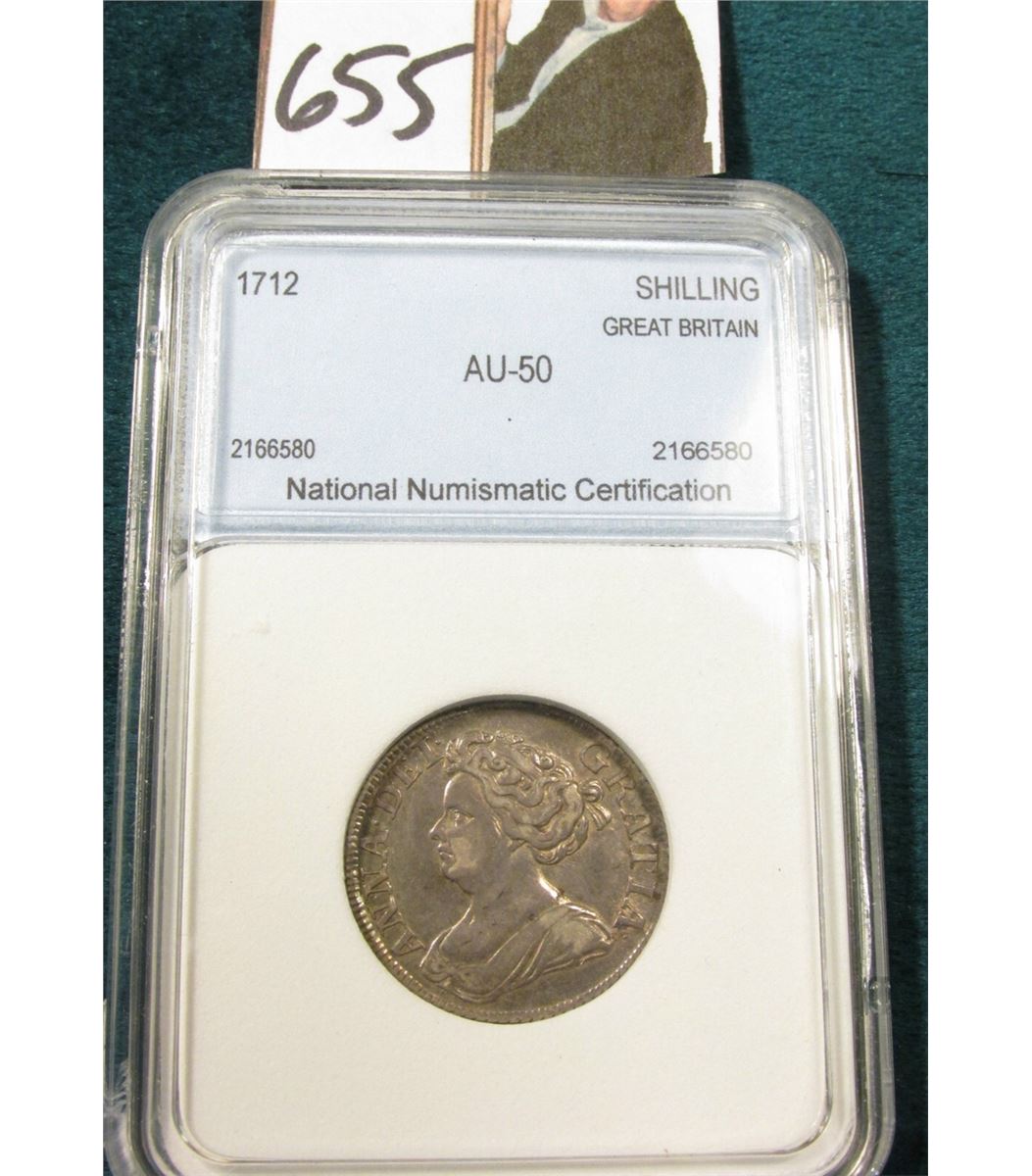 1712 Silver Shilling Great Britain NNC AU50 #2166580 Rare Catalogs @ $750 in XF