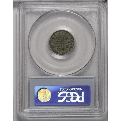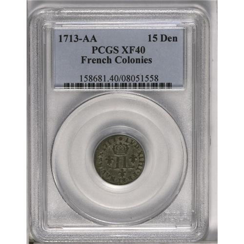 <B>1713-AA<15DEN> French Colonies 15 Deniers XF40 PCGS.</B></I> Rosette After Date. Breen-296, Vlack-14b. While Breen rates the Rosette as more scarce than the Pomegranate variety, Vlack inverts them. Regardless of relative scarcity, this is a very rare coin, evenly worn with pleasing silver-gray surfaces. Listed on page 51 of the 2007 <I>Guide Book.</B></I> Population: 1 in 40, 9 finer (6/06).