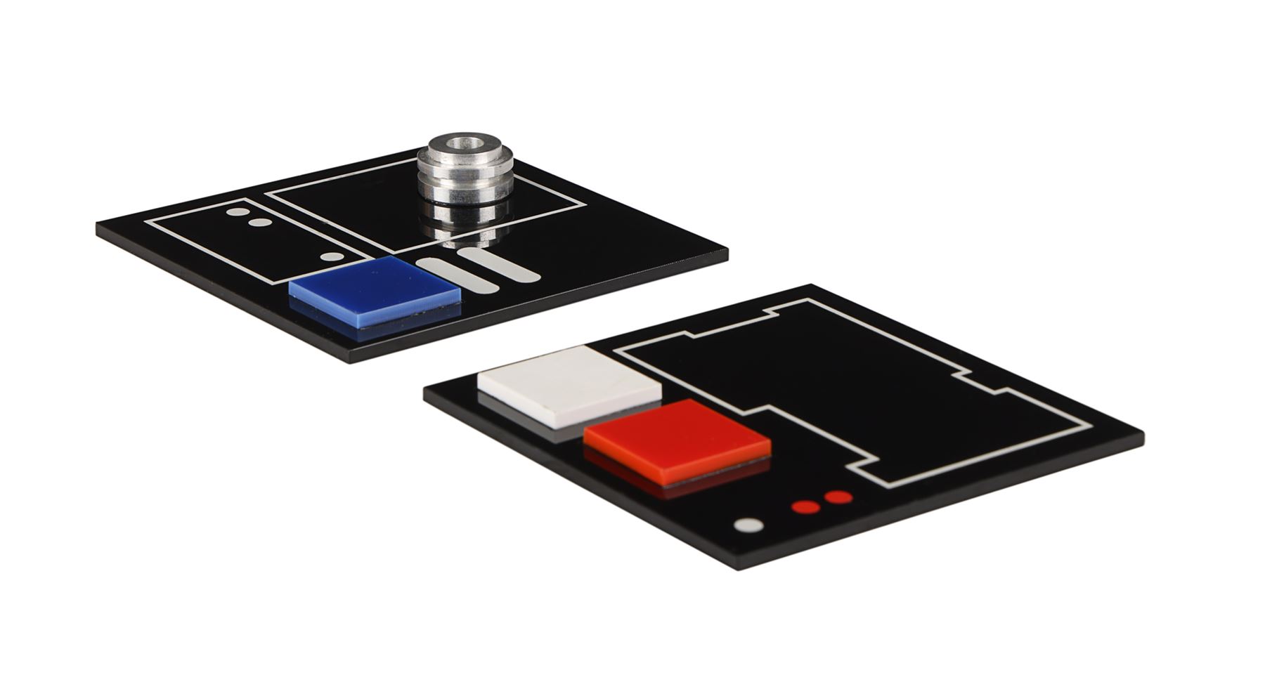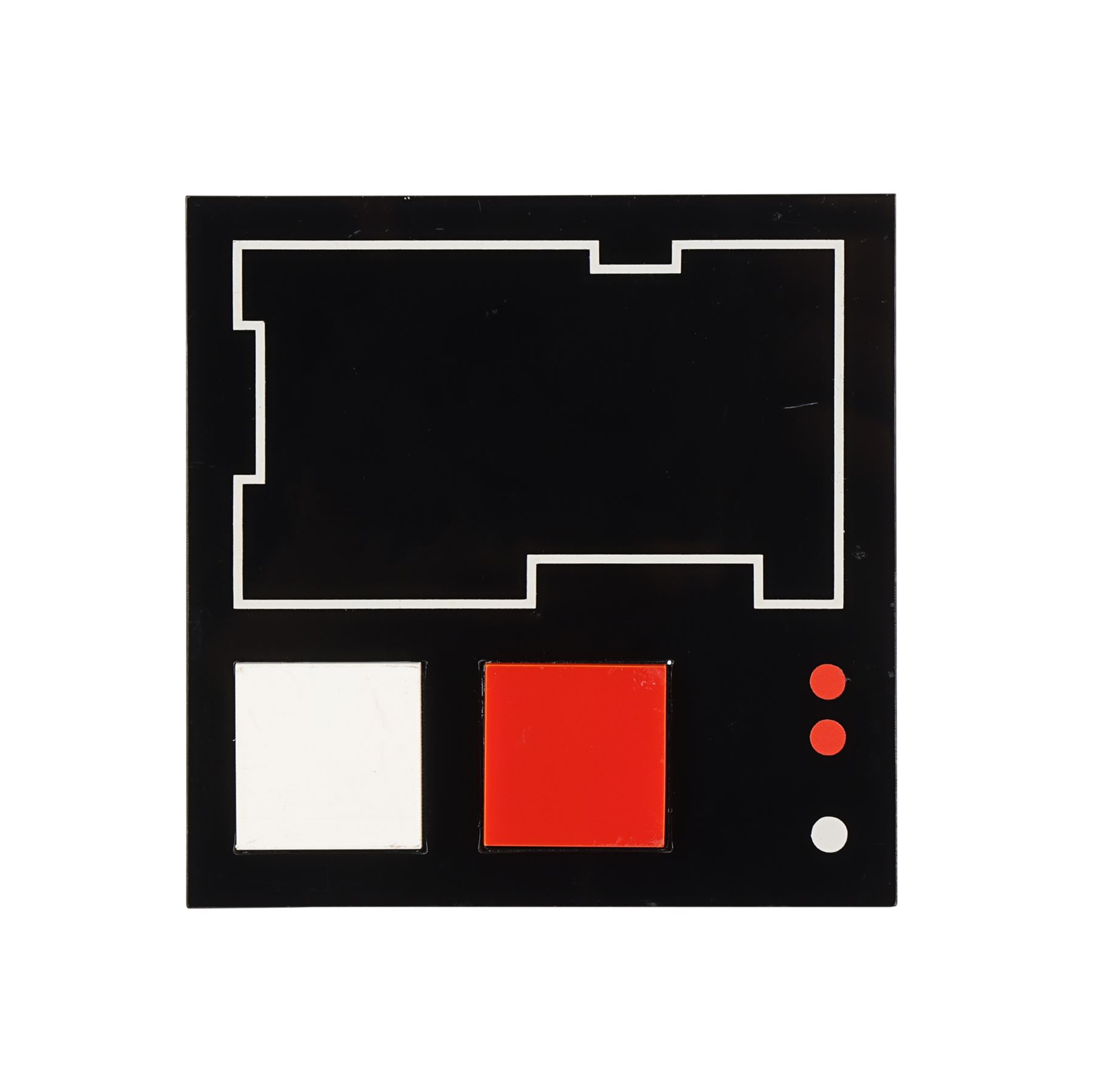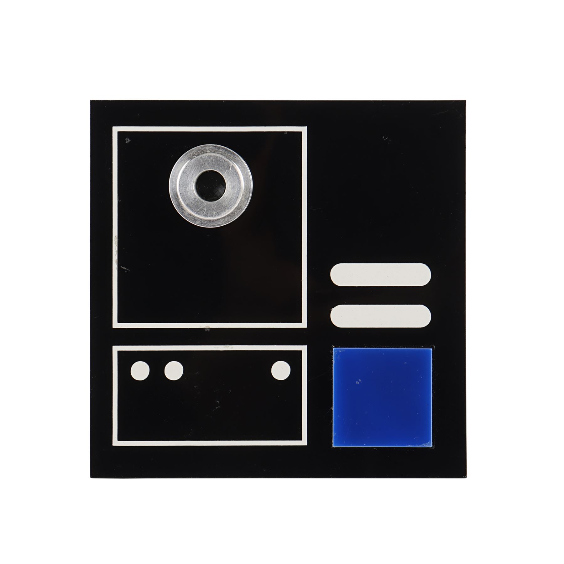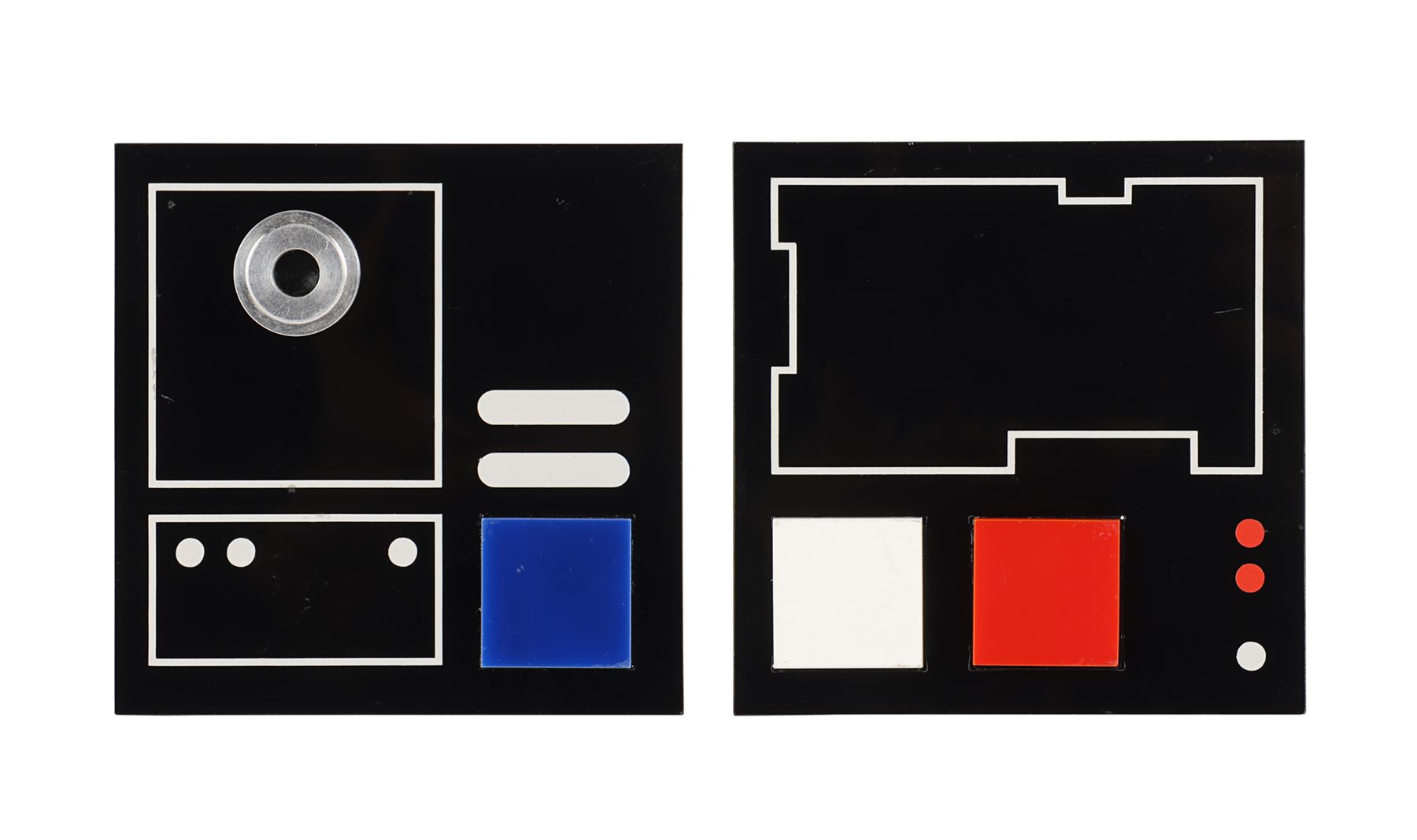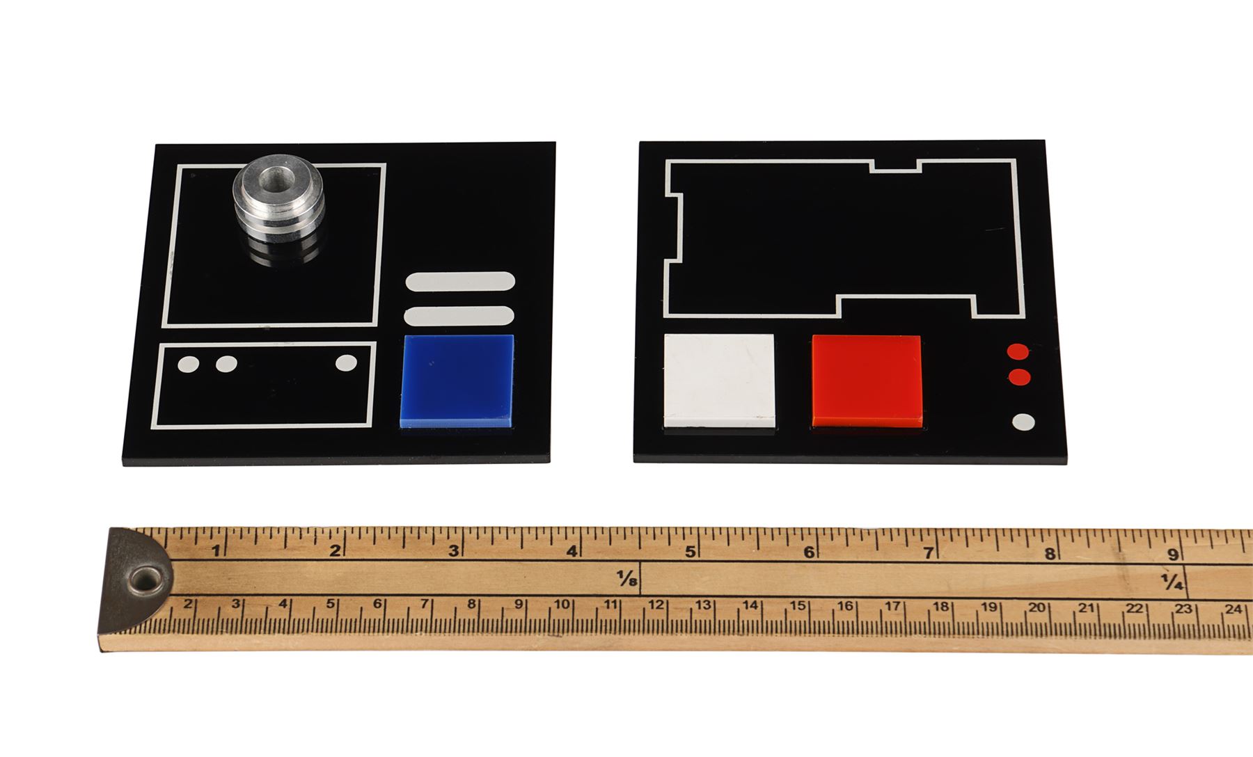 ROGUE ONE: A STAR WARS STORY (2016) - Two Imperial Control Panels - Two Imperial control panels from Gareth Edwards' Rogue One: A Star Wars Story. These panels and others like them were dotted around Imperial ships and bases. The panels are black acrylic and decorated with acrylic buttons. One has a metal greeblie and both have adhesive tape on the reverse. Bubble wrap has adhered to some of the tape. Dimensions (each): 3.75" x 3.75" x 0.25 (9.5 cm x 9.5 cm x 0.75 cm)