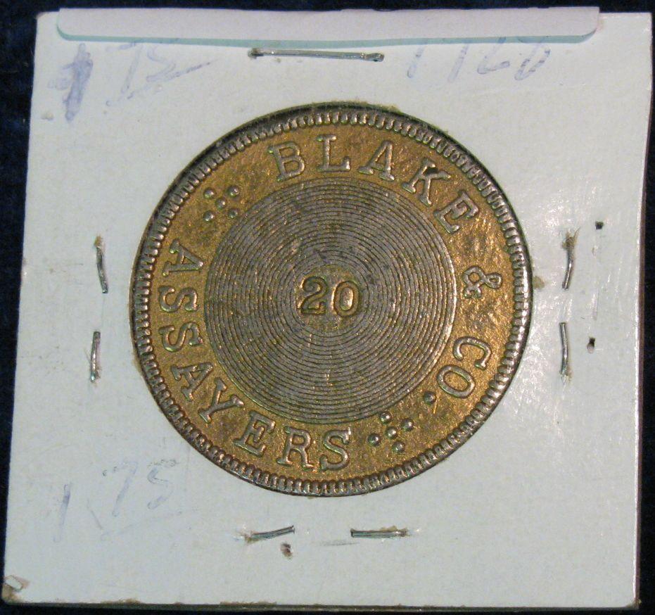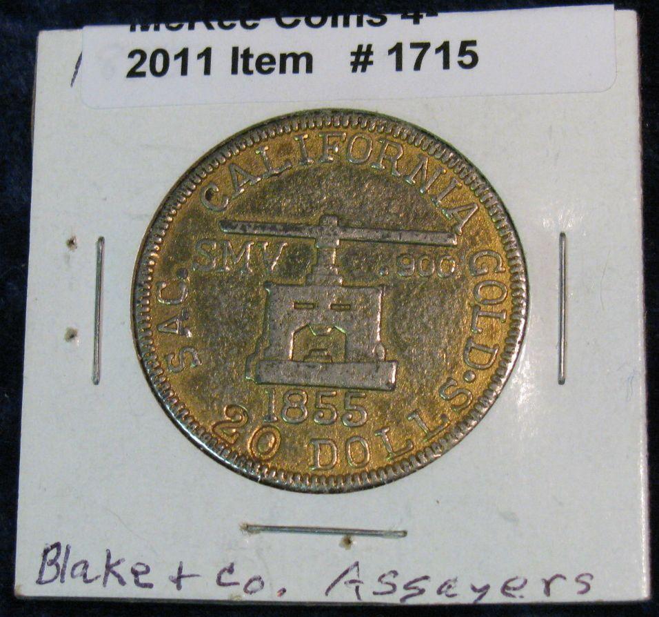 1715. 1855 Blake & Co. Assayers $20 California Gold Copy.