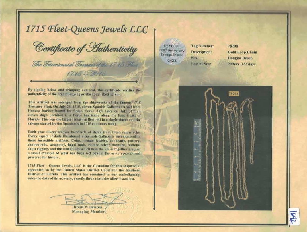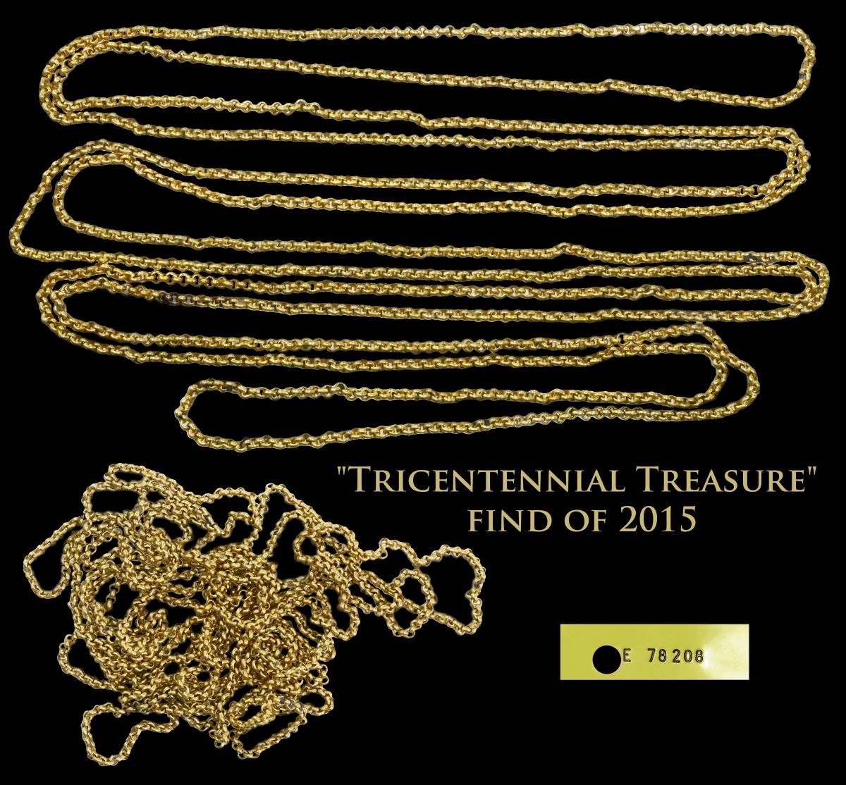 Complete gold plain-loop chain, 34.55 grams, from the "Tricentennial Treasure" find of 2015. 34.55 grams., 32-1/2" long. Hundreds of tiny plain links in a tight chain (easily kinked) that is remarkable for being unbroken and complete, eminently wearable and attractive despite its simplicity, also one of the first artifacts from the famous "Tricentennial Treasure" to be offered for sale. From the 1715 Fleet (Douglass Beach site), with plastic tag #E 78208 and special "Tricentennial Treasure" photo-certificate from Queens Jewels LLC.