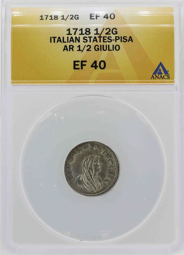 One 1718 Italian States-Pisa 1/2 Giulio Coin ANACS XF40. ANACS Certified.