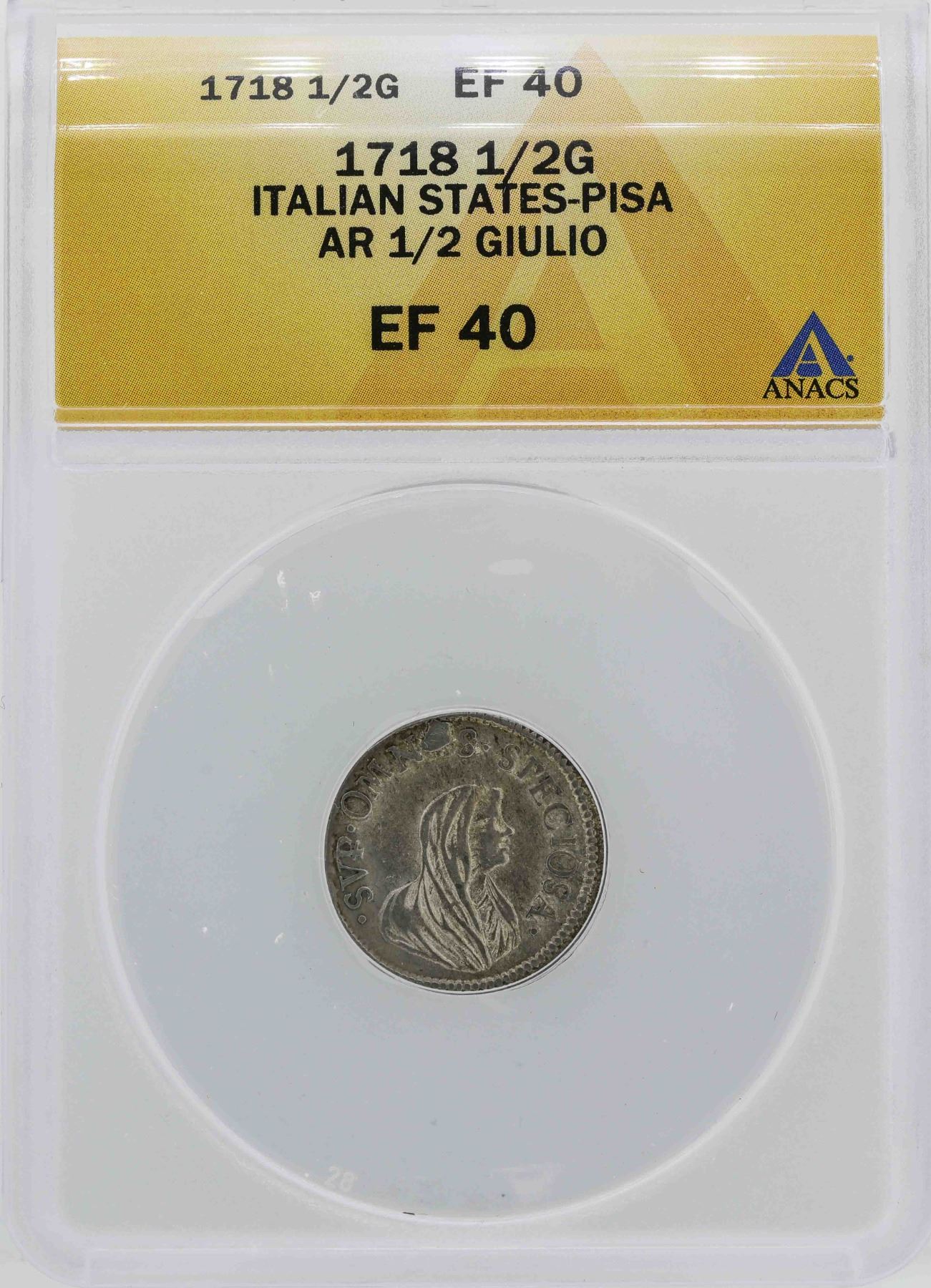 One 1718 Italian States-Pisa 1/2 Giulio Coin ANACS XF40.