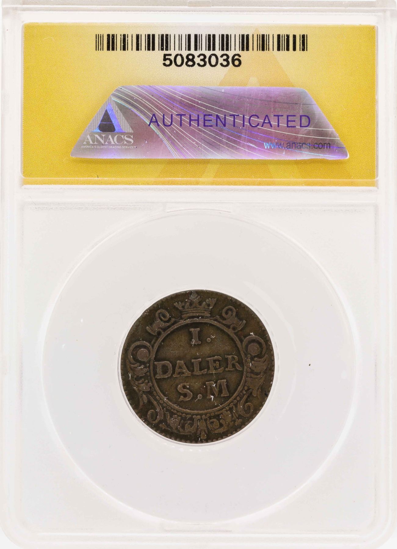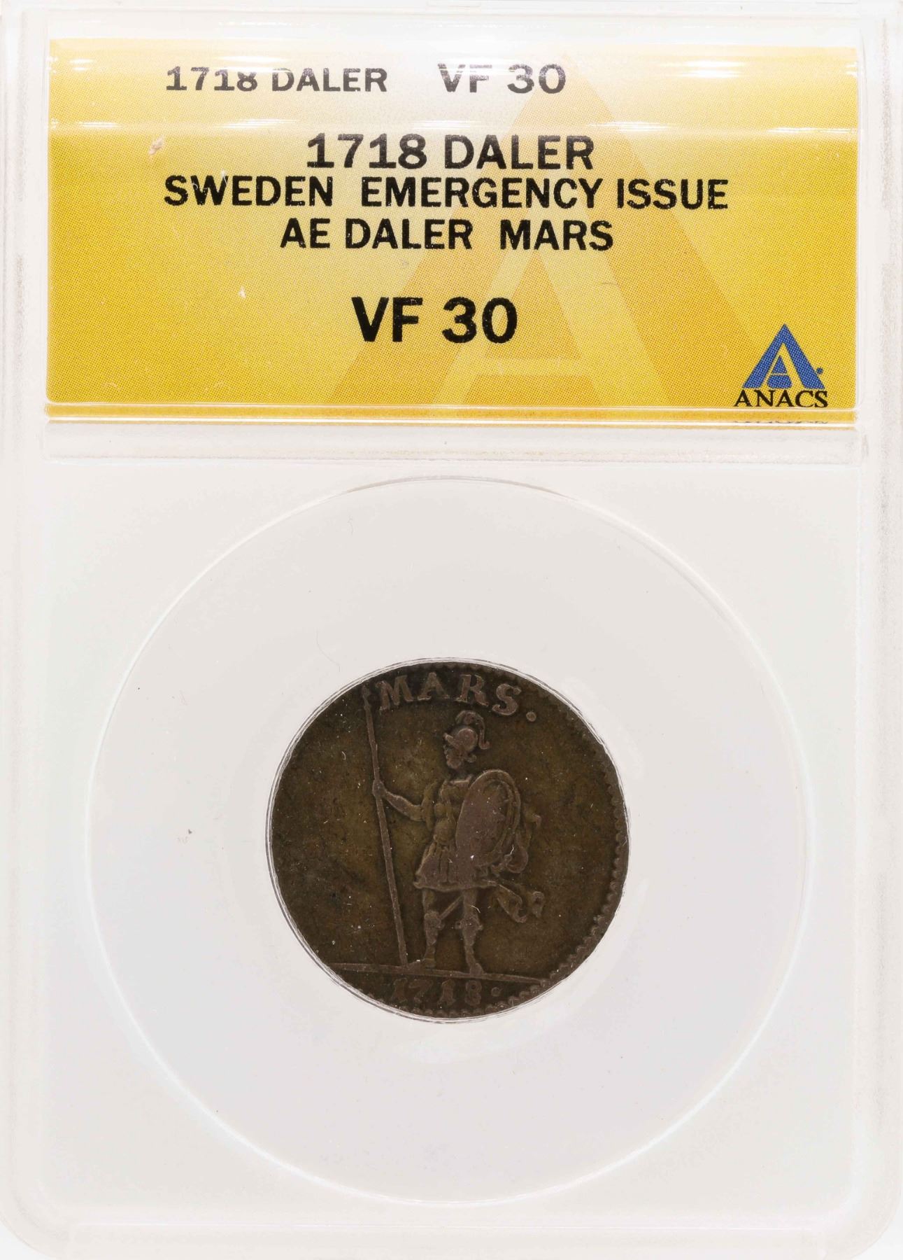 One 1718 Sweden Emergency Issue AE Daler Mars Coin ANACS VF30.