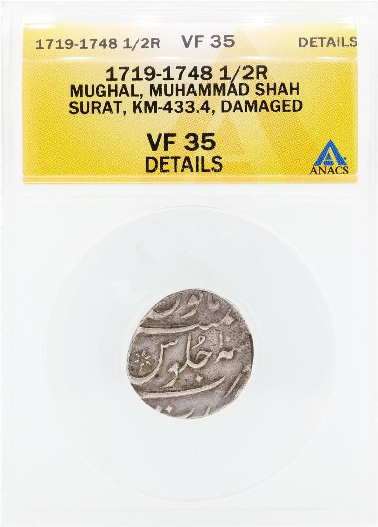 One 1719-1748 1/2 Rupee Mughal Muhammad Shah Surat Damaged Coin ANACS VF35 Details. ANACS Certified.
