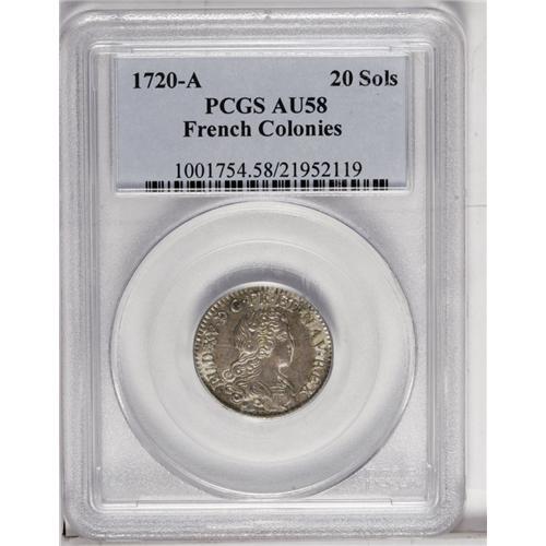 <B>1720-A French Colonies Livre d'argent fin, 1/6 ecu AU58 PCGS.</B></I> Gaudoury-296. An evenly struck and pleasing representative with ample glowing luster. The fields have toned dove-gray and exhibit faint marks. The 1720 date is associated with John Law's Louisiana land speculation, and his control of the French mints. Listed on page 50 of the 2007 <I>Guide Book.</B></I><BR><I>From The Troy Wiseman Collection, Part Two.</B></I><BR><BR><b>Shipping:</b> Coin/Currency (<a target="_blank" href="http://www.heritageauctions.com/common/shipping.php">view shipping information</a>)