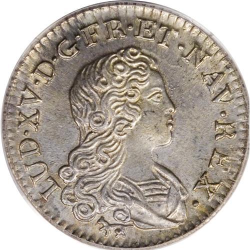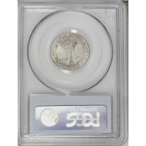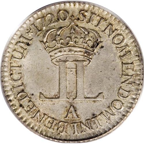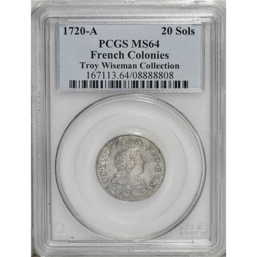 <B>1720-A French Colonies Livre d'argent fin, 1/6 ecu MS64 PCGS.</B></I> Young Bust right/Crowned Back-to-back L's, Gad-296, KM-453. PCGS has incorrectly designated this piece as a 20 sols. This intricately struck and satiny near-Gem has a nearly imperceptible mark on the king's cheek, but is otherwise exemplary. In 1720, John Law was in control of the French mints, which played a major role in his ill-fated Louisiana territory land scheme. Listed on page 50 of the 2007 <I>Guide Book.</B></I><BR><I>From The Troy Wiseman Collection, Part Two.</B></I><BR><BR><b>Shipping:</b> Coin/Currency (<a target="_blank" href="http://www.heritageauctions.com/common/shipping.php">view shipping information</a>)