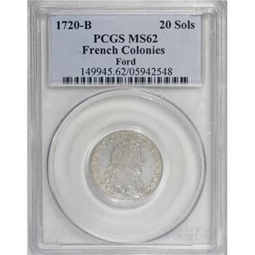<B>1720-B 20 Sols French Colonies, MS62 PCGS</B></I><BR> Gaudoury-295, Hodder-4, Rouen Mint, 62.1 grains. A shimmering and crisply struck piece with peripheral gold toning over surfaces that display a pleasing semiprooflikeness. Minor adjustment marks are relegated to the obverse border. The young king's profile shows light strike-doubling.<BR><I>Ex: John J. Ford, Jr. Collection, Part 14 (Stack's, 1/06), lot 321.</B></I> <BR><BR><b>Shipping:</b> Coins & Currency (<a target="_blank" href="http://www.heritageauctions.com/common/shipping.php">view shipping information</a>)
