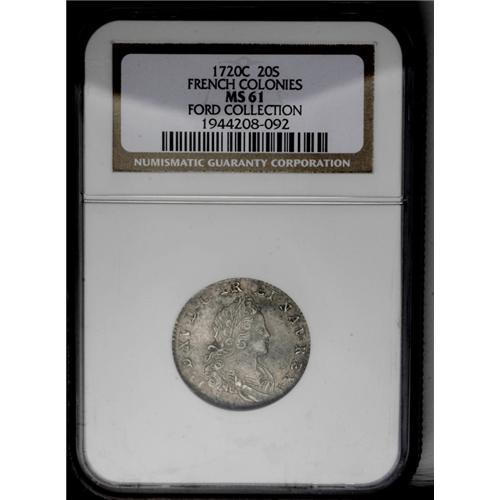 <B>1720-C 20 Sols French Colonies MS61 NGC.</B></I> Gadoury-295. A subdued silver-gray piece that has a small spot behind the head and an occasional area of softer impression.<BR><I>Ex: Or Gestion Numismatique, 11/9/93; John J. Ford, Jr. Collection, Part 14 (Stack's, 1/06), lot 322.</B></I>