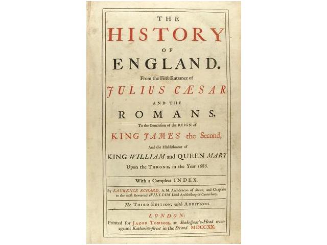 1720., LIBRO: (HISTORIA DE INGLATERRA),. ECHARD, LAURENCE:, THE HISTORY OF ENGLAND FROM THE FIRST ENTRANCE OF JULIUS CAESAR AND THE ROMANS TO THE CONCLUSION OF THE REIGN OF KING JAMES THE SECOND AND THE ESTABLISHMENT OF KING WILLIAM AND QUEEN MARY UPON THE THRONE IN THE YEAR 1688., London: printed for Jacob Tonson, 1720. Folio mayor. 8 h. + 1150 p., 17 h. de índices. Bellas viñetas grabadas. Leve señal marginal de polilla que afecta levemente el texto en algunas p. Papel tostado. Enc. en plena piel, lomo algo rozada. Ex-libris de anterior poseedor.