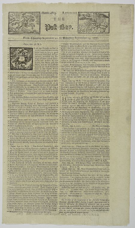 The Post Boy, London, Printed For John Morphew near Stationers-Hall, Sept. 22, 1720, single sheet, small folio. London paper advertising land in Hilton Head, S.C. The land advertisement, which is printed at the top left corner of the back page, is "to the South of Port Royal in Carolina". Port Royal is at the north end of Hilton Head. Continues "containing upwards of One hundred thousand Acres of the richest and cleanest lands in America...for the general benefit of the purchasers of One thousand allotments of the said lands...". A great early advertisement for land in the Carolina colonies. Fine.