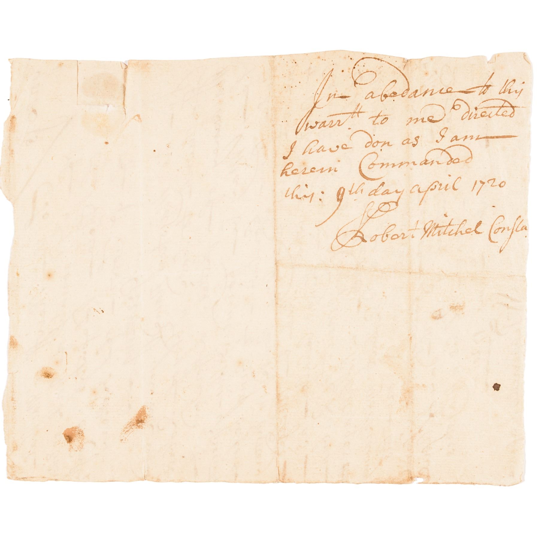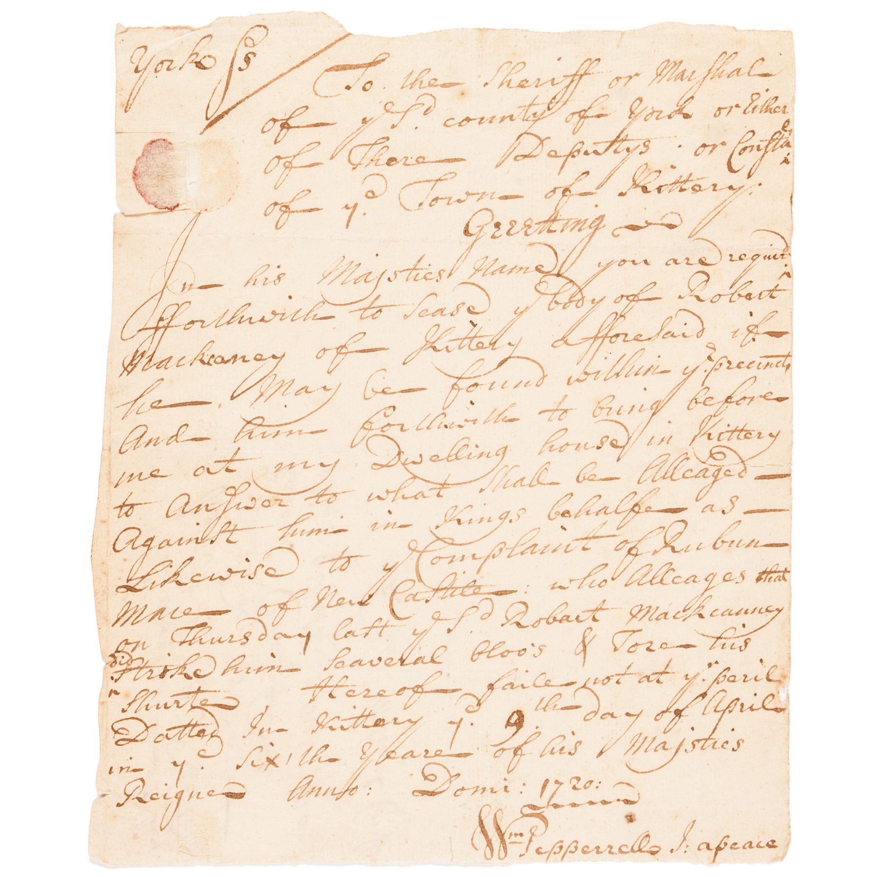 April 9, 1720-Dated Colonial Period Arrest Warrant, Manuscript Document signed by William Pepperell as Justice of the Peace, one page, measuring 7.5” x 6.25”, York County (Maine), Choice Very Fine. Ordering the sheriff or marshal of York County or the constable of the town of Kittery to seize the body of Robert Mackenney to answer a charge from Reuben Mace of New Castle. The charge states that Mackenney struck Mace several blows and tore his shirt. Constable Robert Mitchel signs on the verso that he has done as commanded. Overall, very well written and clear on very clean period laid paper with red wax and paper seal at upper left. A lovely example of this rarely encountered historic figure.