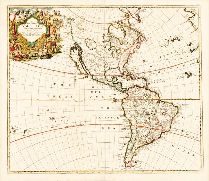 This outstanding, original Engraved Map has beautiful Hand-Coloring, being its full Double-page, large folio, measuring 23.5” x 20.75”. It displays both North and South America with California as an Island, with an indented northern coast. The magnificent highly ornate and colorful cartouche in upper left corner displays scenes of Native Americans and wildlife. It is inscribed: “Most humbly Inscribed to the Right Honorable The Earl of Berkshire &c. Deputy Earl Marshall of England.” Original centerfold with some added deft conservation and reinforcement at bottom on the blank reverse which is not seen on the face. Land areas are outlined in red, yellow and pale blue, the vignette in the upper left appearing much like a gorgeous period print. A highly attractive Map with tremendous fresh eye appeal, that is perfect for display. Tooley, no. 81.