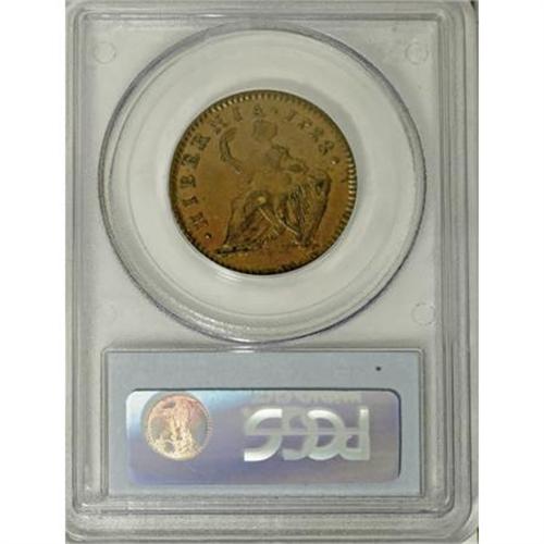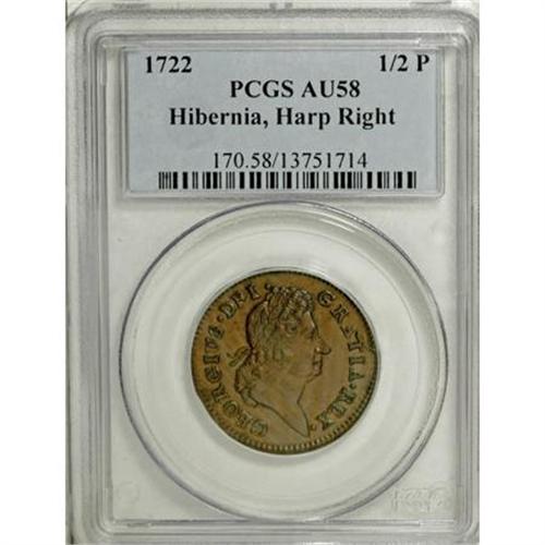 <B>1722 1/2P Hibernia Halfpenny, Type Two, Harp Right AU58 PCGS.</B></I> Breen-146. A lovely chocolate-brown piece with considerable mint gloss and a refreshingly carbon-free and unabraded appearance. Distributed die crumbling confirms late-in-life dies. Listed on page 42 of the 2008 <I>Guide Book</B></I>.<BR><I>From The Liberty Collection of United States Colonial Coinage.</B></I><BR><BR><b>Shipping:</b> Coins & Currency (<a target="_blank" href="http://www.heritageauctions.com/common/shipping.php">view shipping information</a>)
