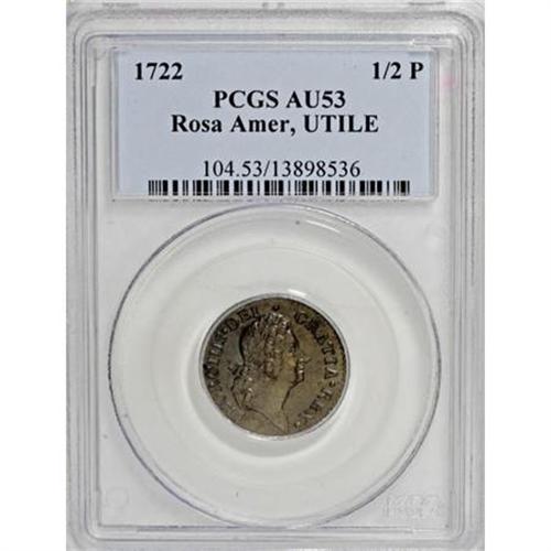 <B>1722 1/2P Rosa Americana Halfpenny, UTILE AU53 PCGS.</B></I> Breen-135, "Extremely rare." The blundered date variety with traces of a 17 over the stop and the 1 in the date. An exquisitely detailed deep brown piece with minor granularity and a solitary thin mark on the cheek. Struck a few degrees off center toward 9 o'clock. Listed on page 40 of the 2008 <I>Guide Book.</B></I><BR><BR><b>Shipping:</b> Coins & Currency (<a target="_blank" href="http://www.heritageauctions.com/common/shipping.php">view shipping information</a>)