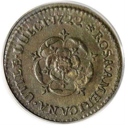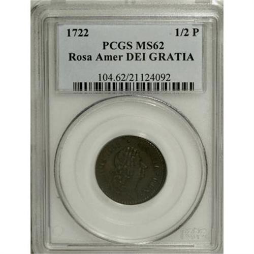 <B>1722 1/2P Rosa Americana Halfpenny, UTILE MS62 Brown PCGS.</B></I> Breen-134. This well struck mahogany-brown piece is unabraded and only minutely granular. Clashed near the king's profile. Very rare in Mint State, since PCGS has certified only three such pieces. Listed on page 40 of the 2008 <I>Guide Book. </B></I>Population: 1 in 62, 2 finer (6/07).<BR><BR><b>Shipping:</b> Coins & Currency (<a target="_blank" href="http://www.heritageauctions.com/common/shipping.php">view shipping information</a>)