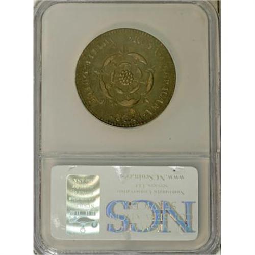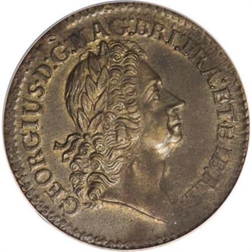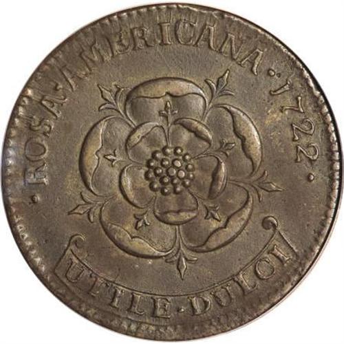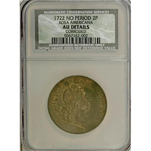 <B>1722 2PENCE Rosa Americana Twopence--Corroded--NCS. AU Details.</B></I> Breen-90. No Period after REX. A bold and unabraded example of this very scarce variety. Traces of olive-brown luster cede to medium brown fields with deeper gray color where moderately granular. Struck from widely rotated dies. Listed on page 41 of the 2008 <I>Guide Book.<BR>Ex: Oak Collection of American Colonial Coinage (Heritage, 9/05), lot 26, which realized $2,990.<BR>From The Liberty Collection of United States Colonial Coinage.</B></I><BR><BR><b>Shipping:</b> Coins & Currency (<a target="_blank" href="http://www.heritageauctions.com/common/shipping.php">view shipping information</a>)
