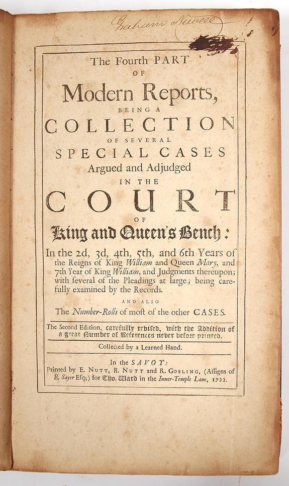[1722 English Law]. "The Fourth Part of Modern Reports, Being a Collection of Several Special Cases in the Court of King and Quen's Bench…In the 2d, 3d, 4th, 5th, and 6th Years of the Reigns of King William and Queen Mary and 7th Year of King William…." Second Edition, published by E. Nutt, R. Nutt and R. Gosling. A highly interesting trial record from 1690 to 1695. Oversized book, 12¾ x 8¼", 424pp, plus index. Printed in gothic typeface. Original worn board covers; front cover detached and spine missing; internally bright and clean, with light toning only. Owner's name, "Graham Newell" penned on title page; early book plate on inside cover.