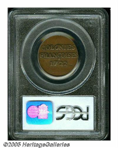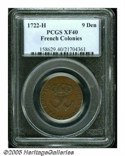 <B>1722-H<9DEN> French Colonies Copper Sou XF40 PCGS.</B></I> Breen-263. This chocolate-brown representative is free from verdigris. Boldly detailed except for the small areas of the upper obverse and lower reverse, which have softer definition, as struck. Extensive evaluation reveals a few mostly inconspicuous pinscratches. Listed on page 38 of the 2005 <I>Guide Book.</B></I>