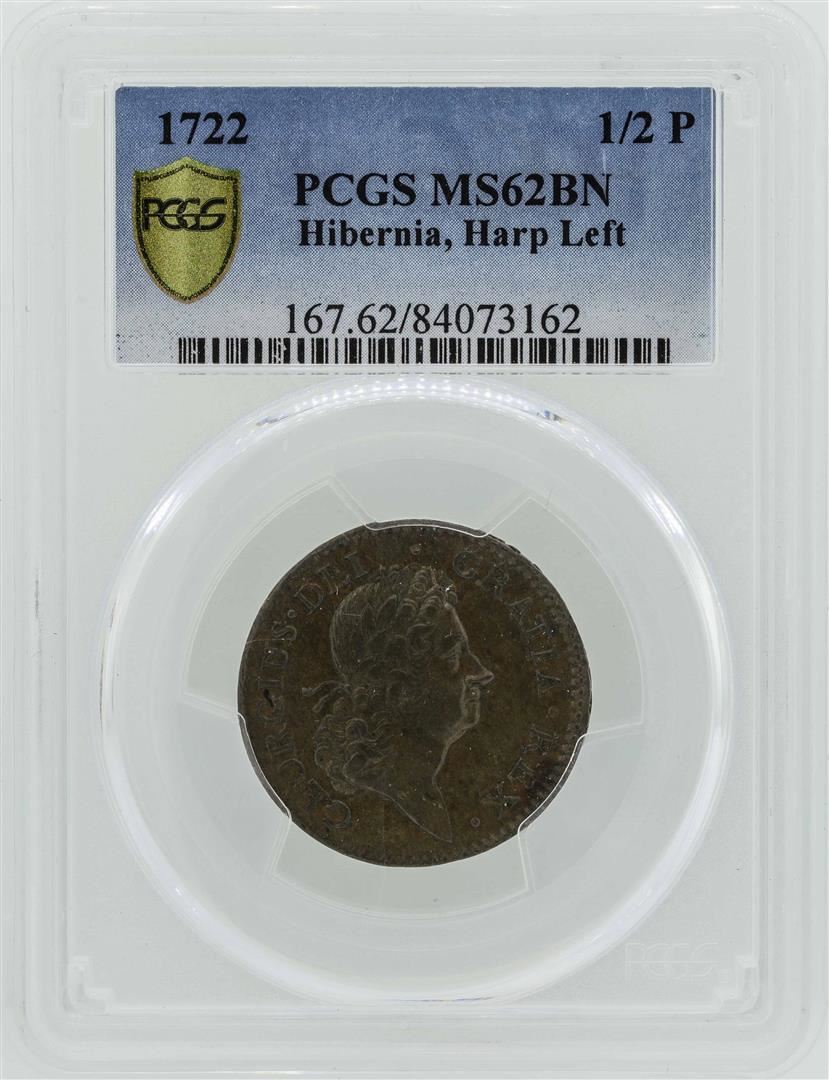 One 1722 Half Penny Hibernia Harp Left Copper Coin PCGS MS62BN. PCGS Graded.