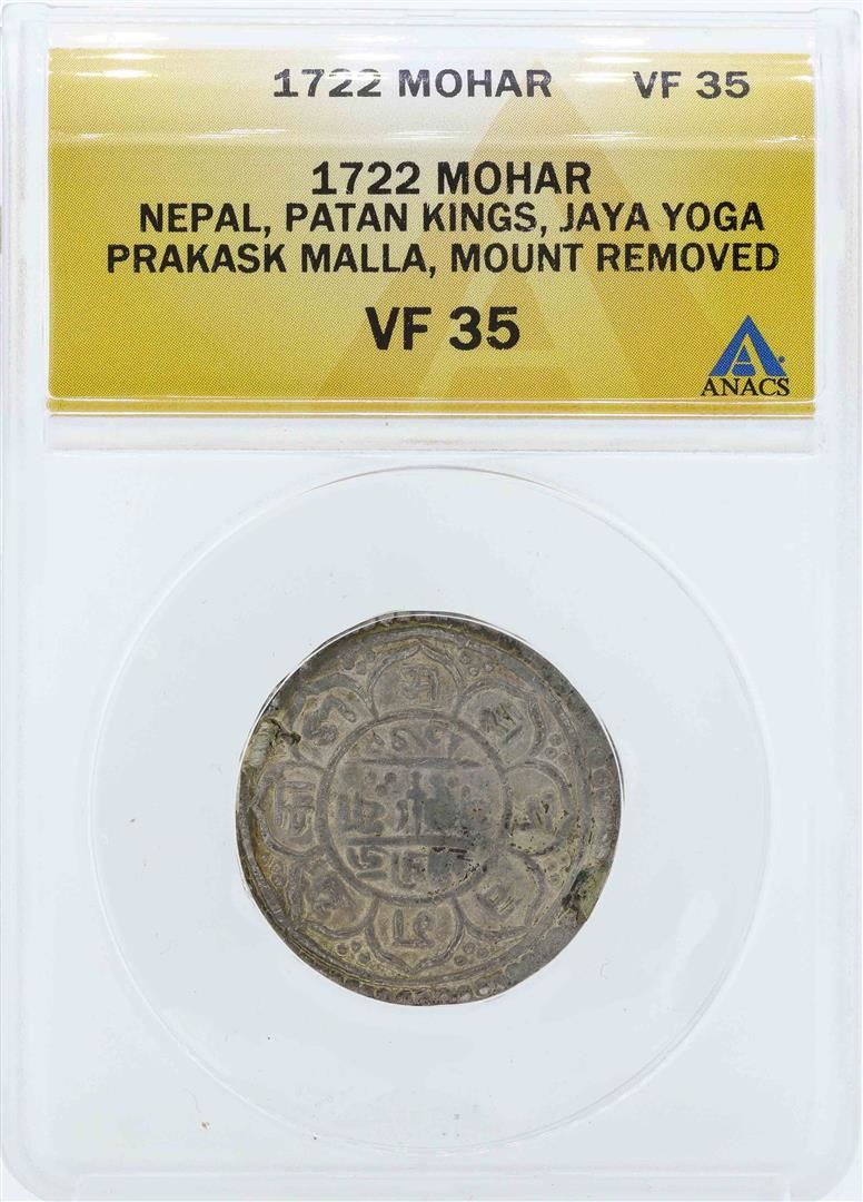 One 1722 Nepal Patan Kings Mohar Coin ANACS VF35. ANACS Appraised.